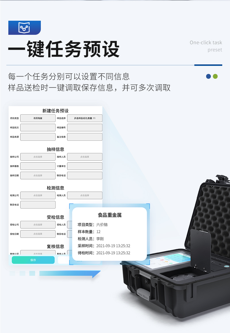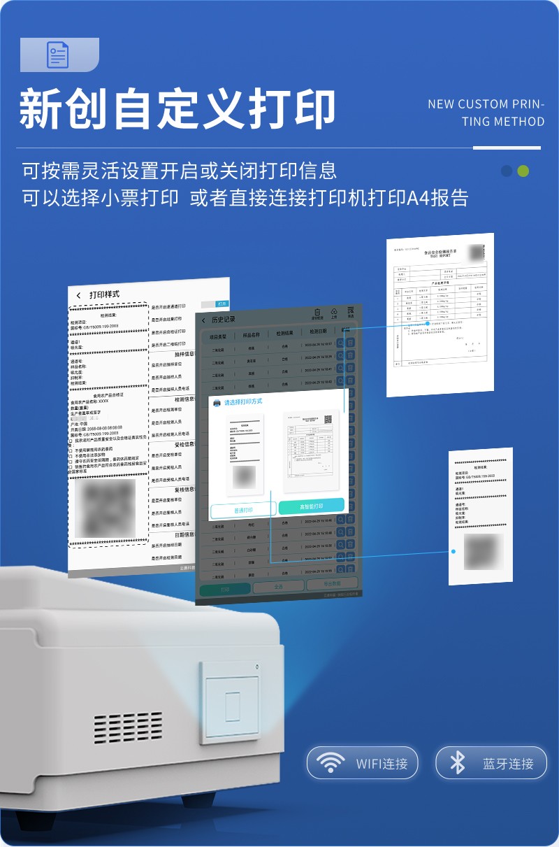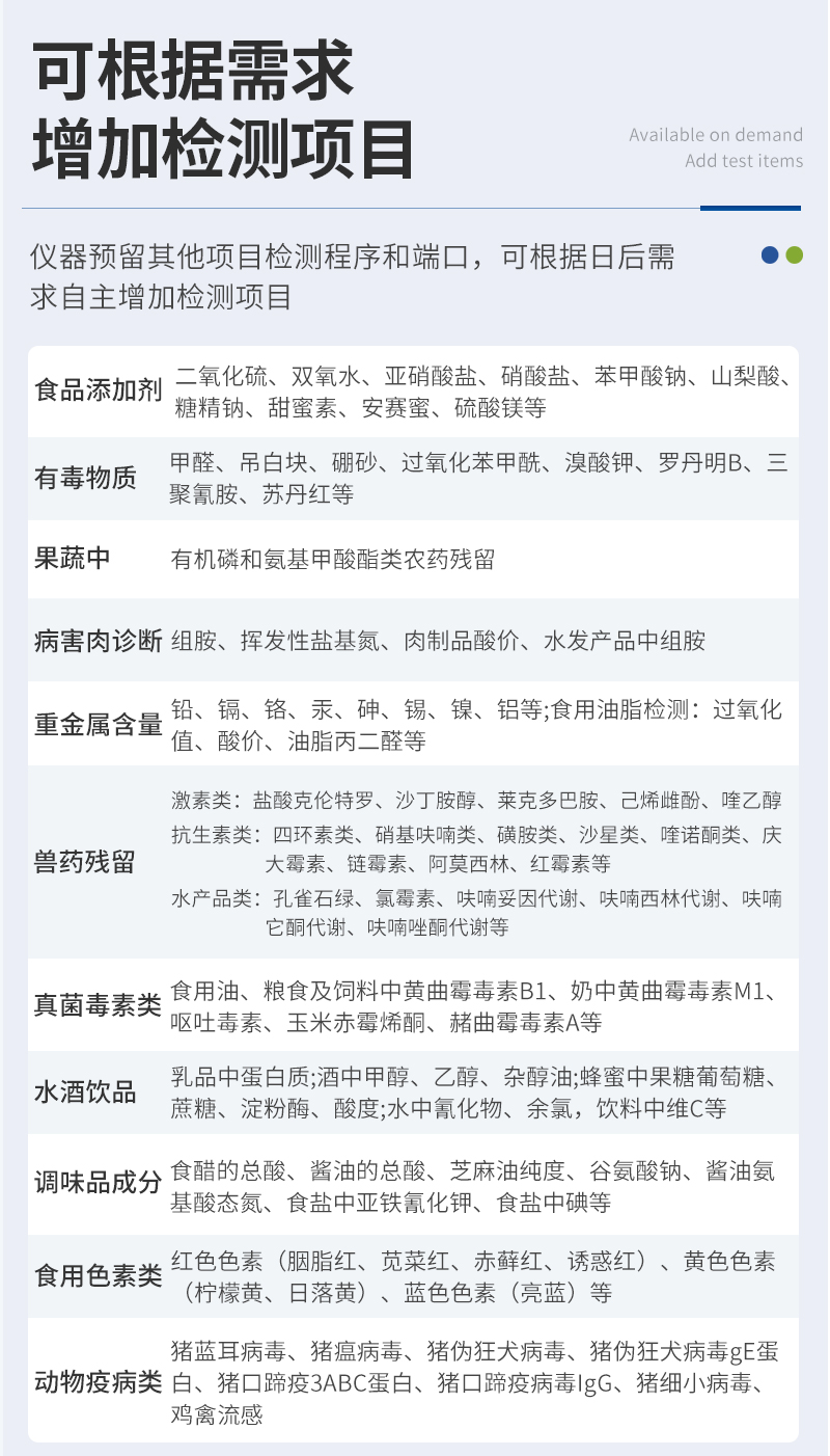 | 儀器采用臺(tái)式一體化系統(tǒng)檢測(cè)技術(shù),將分光光度模塊、數(shù)字化管理模塊、無線通訊模塊高度集成于一體,可支持檢測(cè)60種食品安全檢測(cè)項(xiàng)目,同時(shí)預(yù)留升級(jí)檢測(cè)方法。 | 儀器檢測(cè)模塊標(biāo)準(zhǔn)化、智能化,檢測(cè)項(xiàng)目可隨意自由組合。檢測(cè)箱體內(nèi)置多個(gè)標(biāo)準(zhǔn)檢測(cè)單元,檢測(cè)模塊可以調(diào)整配置。 | 儀器采用全新安卓智能系統(tǒng),主控芯片采用 ARM Cortex-A7,RK3288/4核處理器,10.1寸高清液晶觸摸豎屏,更加**的UI交互界面,運(yùn)轉(zhuǎn)快捷;儀器配備無線通信模塊: 4G(APN)通訊模塊、Wifi模塊,藍(lán)牙傳輸,同時(shí)具有雙USB接口以及RJ45接口能以多種方式實(shí)現(xiàn)數(shù)據(jù)保存和數(shù)據(jù)傳輸功能。 | 顯示屏幕:儀器采用10.1英寸豎向液晶觸摸屏顯,搭配運(yùn)行安卓智能操作系統(tǒng),主控芯片采用ARM Cortex-A7,RK3288/4核處理器,主頻1.88Ghz,操作方便,性能更強(qiáng)。 | 檢測(cè)通道:≥12通道;采用精密旋轉(zhuǎn)比色池設(shè)計(jì),使用同芯片同光源校準(zhǔn)精度,解決不同光源之間的誤差值,更加準(zhǔn)確**。(1-12通道間誤差0.1%,**號(hào):ZL202022821055.2) | 儀器光源:高精度進(jìn)口四波長冷光源,每個(gè)通道均配置 410、520、590、630nm 波長光源,標(biāo)配**的光路切換裝置,**光路切換功能可實(shí)現(xiàn)64波長,并且所有檢測(cè)項(xiàng)目可實(shí)現(xiàn)所有通道同時(shí)檢測(cè)。 | 設(shè)備可一鍵校準(zhǔn),自動(dòng)保存校準(zhǔn)數(shù)據(jù),自動(dòng)對(duì)比校驗(yàn),得到精準(zhǔn)光源,采用Android SP存儲(chǔ)數(shù)據(jù),光源數(shù)據(jù)永不丟失,方便每一次使用。 | 通訊接口:配備無線通信模塊、4G(APN)通訊模塊、藍(lán)牙傳輸,同時(shí)具有雙USB接口以及RJ45網(wǎng)線接口,可以多方式實(shí)現(xiàn)數(shù)據(jù)保存及數(shù)據(jù)傳輸。 | 存儲(chǔ)方式:支持U盤存儲(chǔ),標(biāo)準(zhǔn)USB接口,免驅(qū)動(dòng)安裝。檢測(cè)結(jié)果存儲(chǔ)容量20萬條以上,可生成Excel表格進(jìn)行拷貝,并具有登錄保護(hù)功能。 | 智能化操作系統(tǒng): | 1、操作系統(tǒng):儀器可在同一檢測(cè)界面自動(dòng)對(duì)應(yīng)相關(guān)檢測(cè)通道,一次性選擇1-12個(gè)樣品名稱,無需退出界面,節(jié)省操作時(shí)間。并可以對(duì)每個(gè)通道屬性和樣品信息單獨(dú)進(jìn)行編輯,例如送檢單位、人員,檢測(cè)人員等,打印時(shí)勾選打印顯示。 | 2、數(shù)據(jù)集成系統(tǒng):設(shè)備首頁自動(dòng)匯總分析檢測(cè)數(shù)據(jù),包含:周檢測(cè)數(shù)據(jù)、月檢測(cè)數(shù)據(jù),全部檢測(cè)總數(shù)量,均包含檢測(cè)總數(shù),合格數(shù),不合格數(shù),以及相關(guān)柱形分析圖,各項(xiàng)檢測(cè)數(shù)據(jù)一目了然,無需電腦查詢,更加快捷直觀。 | 3、數(shù)據(jù)庫系統(tǒng):十幾項(xiàng)數(shù)據(jù)庫分類管理儀器:包含項(xiàng)目類型、項(xiàng)目數(shù)據(jù)、檢測(cè)數(shù)據(jù)、歷史記錄、國標(biāo)信息、曲線信息、采樣信息、檢測(cè)信息、受檢信息、復(fù)核信息、圖表信息、光源校準(zhǔn)信息、打印樣式信息、樣品庫信息等等,數(shù)據(jù)庫之間互相協(xié)調(diào)聯(lián)動(dòng)保證數(shù)據(jù)的真實(shí)完整性。同時(shí)產(chǎn)品數(shù)據(jù)庫以及歷史檢測(cè)記錄支持一鍵檢索功能。 | 4、限量規(guī)判系統(tǒng):具有限量查詢、添加物質(zhì)合規(guī)判定系統(tǒng)。檢測(cè)出結(jié)果后,系統(tǒng)自動(dòng)調(diào)用系統(tǒng)數(shù)據(jù)庫中相關(guān)國標(biāo)進(jìn)行比對(duì)判定,客觀顯示判定結(jié)果是否合格。 | 5、項(xiàng)目預(yù)設(shè)系統(tǒng):儀器具有任務(wù)預(yù)設(shè)模塊,一鍵提前預(yù)設(shè),給出方便快捷的新檢測(cè)方案,每一個(gè)任務(wù)分別可以設(shè)置不同的樣品、批次、編號(hào)、來源、備注、抽樣信息、檢測(cè)信息、受檢信息、復(fù)核信息等更多信息。樣品送檢時(shí)一鍵調(diào)取保存信息,并可多次調(diào)取,大大提高檢測(cè)效率。 | 6、數(shù)據(jù)監(jiān)管系統(tǒng):同步對(duì)接監(jiān)管平臺(tái),數(shù)據(jù)可局域網(wǎng)和互聯(lián)網(wǎng)數(shù)據(jù)上傳,檢測(cè)結(jié)果可選擇直接傳至食品安全監(jiān)管平臺(tái)。進(jìn)行區(qū)域食品安全監(jiān)管及大數(shù)據(jù)分析處理與數(shù)據(jù)統(tǒng)計(jì),檢測(cè)區(qū)域食品安全長短期動(dòng)態(tài),達(dá)到食品安全問題預(yù)估、預(yù)警。 | 7、全新打印系統(tǒng):內(nèi)置全新打印機(jī),新創(chuàng)自定義打印方式,可按需靈活勾選控制:二維碼,抽樣信息、檢測(cè)信息,受檢信息、復(fù)核信息、抽樣日期、檢測(cè)日期等信息的打印。 | 8、A4紙版本報(bào)告打印功能(可選配):設(shè)備擁有兩種結(jié)果展示方式,可以自動(dòng)生成A4打印模板和小票打印模板兩種樣式,可通過WiFi及網(wǎng)線等方式鏈接外置打印機(jī)可進(jìn)行打印。 | 供電模式:儀器交直流兩用,直流12V供電,可連接車載電源,可配6ah大容量充電鋰電池,電量可實(shí)時(shí)顯示,方便戶外流動(dòng)測(cè)試。 | 儀器具備遠(yuǎn)程升級(jí)功能,可定向分客戶分儀器更新,開機(jī)后自動(dòng)更