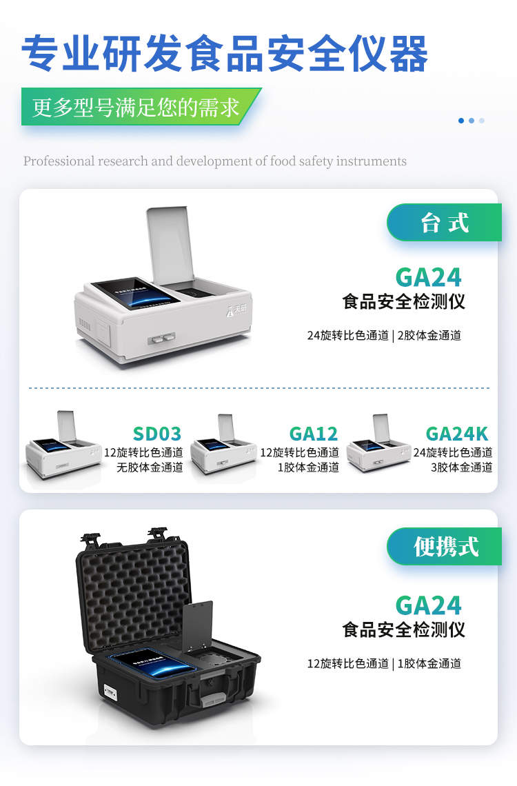 | 食品添加劑:二氧化硫、雙氧水、亞硝酸鹽、硝酸鹽、苯甲酸鈉、山梨酸鉀、糖精鈉、甜蜜素、木耳硫酸鎂等 | 有毒有害物質(zhì):甲醛、吊白塊、硼砂、過氧化苯甲酰、溴酸鉀、羅丹明B、三聚氰胺、蘇丹紅、工業(yè)堿、尿素、明礬等 | 食用油脂:過氧化值、酸價等 | 果蔬:農(nóng)藥殘留(酶抑制率法) | 病害肉:組胺、揮發(fā)性鹽基氮 | 重金屬含量: 鉛、鎘、鉻、汞、砷、錫、鎳、鋁等 | 瘦肉精激素:鹽酸克倫特羅、沙丁胺醇、萊克多巴胺、己烯雌酚等 | 抗生素殘留:四環(huán)素類、硝基呋喃類、磺胺類、β-興奮劑類、沙星類、磺胺類、喹諾酮類,甲砜霉素,氟苯尼考,金剛烷胺、替米考星、慶大霉素、林可霉素、鏈霉素、恩諾沙星、環(huán)丙沙星、頭孢啦啶、青霉素、阿莫西林等 | 水產(chǎn)品安全類:孔雀石綠、氯霉素、呋喃妥因、呋喃西林、呋喃它酮、呋喃唑酮等 | 蛋類藥物殘留:氯霉素,四環(huán)素,磺胺類,喹諾酮類,呋喃西林,呋喃它酮,呋喃妥因,呋喃唑酮,氟苯尼考,阿莫西林、頭孢氨芐、紅霉素、鏈霉素等 | 真菌毒素殘留:食用油、糧食及飼料中黃曲霉毒素B1、黃曲霉毒素總量,奶中黃曲霉毒素M1、嘔吐毒素、玉米赤霉烯酮、赭曲霉毒素A、T2毒素、伏馬毒素等 | 水酒飲品分析:酒中甲醇、乙醇、乳品及牛奶中蛋白質(zhì), | 蜂蜜成分:果糖和葡萄糖、蔗糖、淀粉酶、酸度等 | 調(diào)味品成分:食醋的總酸、醬油的總酸、芝麻油純度、谷氨酸鈉、醬油氨基酸態(tài)氮、食鹽中亞鐵氰化鉀、食鹽中碘等 | 食用色素類:紅色色素(胭脂紅、莧菜紅、莧菜紅)、黃色色素(檸檬黃、日落黃)、藍色色素(亮藍)等 | 動物疫病類:禽流感、新城疫、牛羊口蹄疫、牛羊結(jié)核病、牛羊包蟲、牛羊布病、小反芻獸、豬藍耳病毒、豬瘟病毒、豬偽狂犬病毒、豬細小、豬圓環(huán)、犬細小病毒、犬瘟熱病毒、犬狂犬病毒等 |