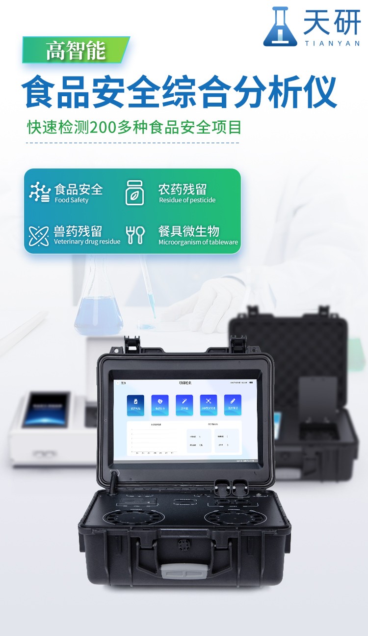 產(chǎn)品介紹: 山東天研儀器有限公司生產(chǎn)的高智能食品安全檢測儀為集成化食品安全快速檢測分析設(shè)備,采用臺式一體化設(shè)計,可快速檢測200多種食品安全項目,包含非食用化學(xué)物質(zhì)、濫用食品添加劑、農(nóng)藥殘留、獸藥殘留、重金屬、病害肉、營養(yǎng)強化劑、抗生素類殘留、激素類殘留、真菌毒素類殘留、化學(xué)類殘留等項目的