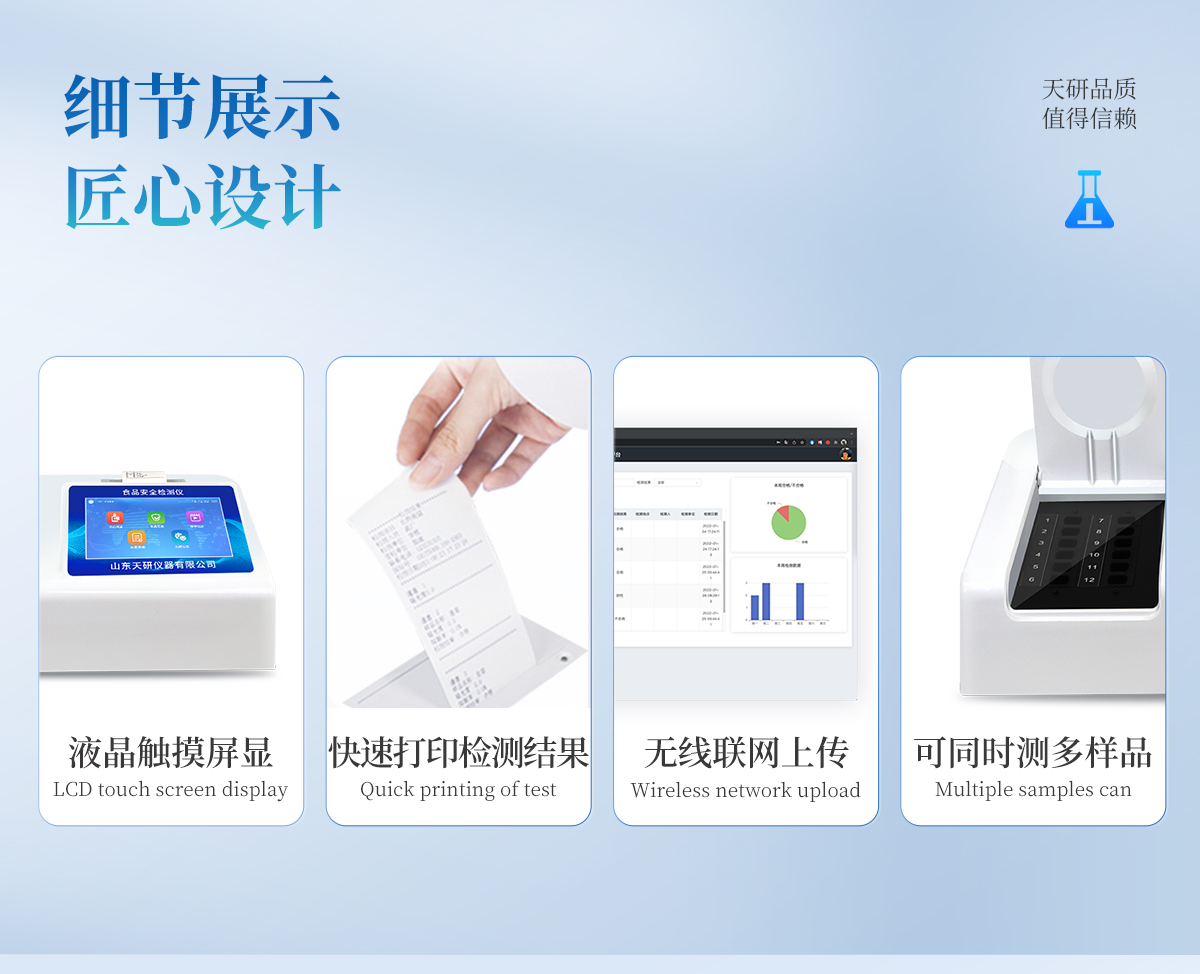 | 安卓智能操作系統(tǒng),采用更加**和人性化操作,儀器具有網(wǎng)線(xiàn)連接、wifi聯(lián)網(wǎng)上傳、GPRS無(wú)線(xiàn)遠(yuǎn)傳功能,快速上傳數(shù)據(jù)。 | 智能化程度高,儀器具有自檢功能:具有開(kāi)機(jī)自檢和調(diào)零功能,具有自動(dòng)檢測(cè)重復(fù)性功能。 | 檢測(cè)通道:≥12個(gè)檢測(cè)通道,可以同時(shí)測(cè)試多個(gè)樣品,每個(gè)樣品由程序控制分別獨(dú)立工作,不會(huì)互相干擾。 | 顯示方式:≥8英寸液晶觸摸屏顯示,人性化中文操作界面,讀數(shù)直觀、簡(jiǎn)單。 | 配備新一代嵌入式熱敏打印機(jī),可選擇手動(dòng)打印或者自動(dòng)打印,檢測(cè)完成可自動(dòng)打印檢測(cè)報(bào)告和二維碼。 | 光源采用進(jìn)口超高亮發(fā)光二極管,高精度、穩(wěn)定性強(qiáng)、光源可控、可以關(guān)掉不使用的光源,功耗更低。 | 采用USB2.0接口設(shè)計(jì),方便數(shù)據(jù)的存貯和移動(dòng),并可隨時(shí)與計(jì)算機(jī)直接相連,并且可用計(jì)算機(jī)控制儀器。實(shí)現(xiàn)數(shù)據(jù)查詢(xún)、瀏覽、分析、統(tǒng)計(jì)、打印等。 | 儀器帶有監(jiān)管平臺(tái)。數(shù)據(jù)可局域網(wǎng)和互聯(lián)網(wǎng)數(shù)據(jù)上傳,檢測(cè)結(jié)果直接傳至食品安全監(jiān)管平臺(tái)。進(jìn)行區(qū)域食品安全監(jiān)管及大數(shù)據(jù)分析處理,檢測(cè)區(qū)域食品安全長(zhǎng)短期動(dòng)態(tài),達(dá)到食品安全問(wèn)題預(yù)估、預(yù)警 | 一體化便攜式快檢設(shè)備,滿(mǎn)足現(xiàn)場(chǎng)及流動(dòng)檢測(cè)使用需求,能夠在同一軟件下實(shí)現(xiàn)所有檢測(cè)項(xiàng)目的檢測(cè),并可通過(guò)同一窗口直觀顯示檢測(cè)結(jié)果。 | 儀器具有多品類(lèi)多種類(lèi)樣品菜單庫(kù),可靈活選擇檢測(cè)樣品,不同的檢測(cè)通道可同時(shí)檢測(cè)不同的樣品項(xiàng)目。也可在儀器上直接編輯錄入樣品名稱(chēng)、檢測(cè)指標(biāo)、送檢單位等信息并保存進(jìn)樣品數(shù)據(jù)庫(kù)。 | 樣品處理簡(jiǎn)單省力,整體操作快速、安全、便捷。 | 儀器具有自身保護(hù)功能,可設(shè)置用戶(hù)名及密碼,防止非工作人員操作等。 | 高靈敏度,高檢測(cè)精度,高重復(fù)性精度,掃描式高精度光學(xué)傳感器。 | 儀器具有重新校準(zhǔn)、鎖定、恢復(fù)出廠(chǎng)設(shè)置功能。 | 支持U盤(pán)存儲(chǔ)。 結(jié)果判定線(xiàn)可修改,對(duì)照值標(biāo)定值可保存,斷電不丟失數(shù)據(jù)。 |