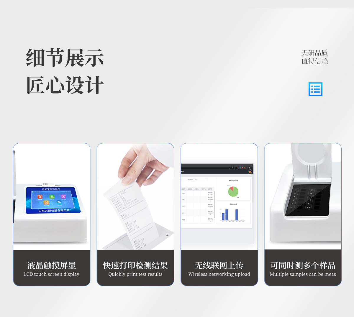 產(chǎn)品介紹:多功能食品安全檢測儀可快速檢測200多項(xiàng)目,包含非食用化學(xué)物質(zhì)、濫用食品添加劑、農(nóng)藥殘留、獸藥殘留、重金屬、病害肉、營養(yǎng)強(qiáng)化劑、抗生素類殘留、激素類殘留、真菌毒素類殘留、化學(xué)類殘留等現(xiàn)場的定性定量檢測。該多功能食品安全檢測儀為集成化食品安全快速檢測分析設(shè)備,廣泛應(yīng)用于市場監(jiān)管局、檢測中心、衛(wèi)生