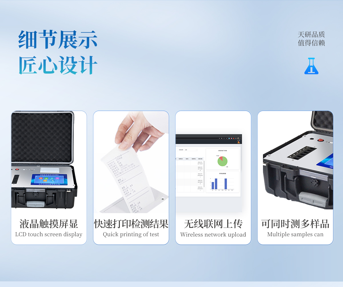 產(chǎn)品介紹: 多功能食品安全檢測儀可快速檢測200多項目,包含非食用化學(xué)物質(zhì)、濫用食品添加劑、農(nóng)藥殘留、獸藥殘留、重金屬、病害肉、營養(yǎng)強化劑、抗生素類殘留、激素類殘留、真菌毒素類殘留、化學(xué)類殘留等現(xiàn)場的定性定量檢測。該多功能食品安全檢測儀為集成化食品安全快速檢測分析設(shè)備,廣泛應(yīng)用于市場監(jiān)