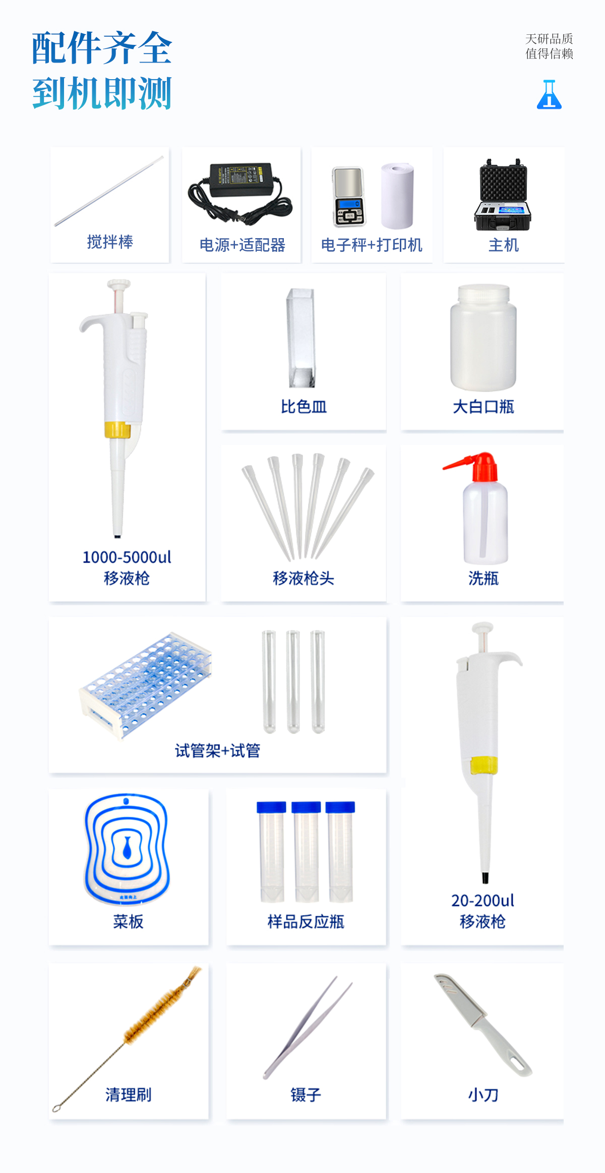 | 食品添加劑:二氧化硫、雙氧水、亞硝酸鹽、硝酸鹽、苯甲酸鈉、山梨酸、糖精鈉、甜蜜素、安賽蜜、硫酸鎂等 | 有毒有害物質(zhì):甲醛、吊白塊、硼砂、過氧化苯甲酰、溴酸鉀、羅丹明B、三聚氰胺、蘇丹紅等 | 果蔬中:有機磷和氨基甲酸酯類農(nóng)藥殘留; | 病害肉診斷:組胺、揮發(fā)性鹽基氮、肉制品酸價、水發(fā)產(chǎn)品中組胺 | 重金屬含量:鉛、鎘、鉻、汞、砷、錫、鎳、鋁等;食用油脂檢測:過氧化值、酸價、油脂丙二醛等。 | 瘦肉精激素類(獸藥):鹽酸克倫特羅、沙丁胺醇、萊克多巴胺、己烯雌酚、喹乙醇等 | 抗生素殘留類(獸藥):四環(huán)素類、硝基呋喃類、磺胺類、沙星類、喹諾酮類、慶大霉素、鏈霉素、阿莫西林、紅霉素等 | 水產(chǎn)品安全類:孔雀石綠、氯霉素、呋喃妥因代謝、呋喃西林代謝、呋喃它酮代謝、呋喃唑酮代謝等 | 真菌毒素類:食用油、糧食及飼料中黃曲霉毒素B1、奶中黃曲霉毒素M1、嘔吐毒素、玉米赤霉烯酮、赭曲霉毒素A等 | 水酒飲品分析:乳品及牛奶中蛋白質(zhì);酒中甲醇、乙醇、雜醇油;蜂蜜中果糖和葡萄糖、蔗糖、淀粉酶、酸度;水中氰化物、余氯,飲料中維C等 | 調(diào)味品成分:食醋的總酸、醬油的總酸、芝麻油純度、谷氨酸鈉、醬油氨基酸態(tài)氮、食鹽中亞鐵氰化鉀、食鹽中碘等 | 食用色素類:紅色色素(胭脂紅、莧菜紅、赤蘚紅、誘惑紅)、黃色色素(檸檬黃、日落黃)、藍(lán)色色素(亮藍(lán))等 | 動物疫病類:豬藍(lán)耳病毒、豬瘟病毒、豬偽狂犬病毒、豬偽狂犬病毒gE蛋白、豬口蹄疫3ABC蛋白、豬口蹄疫病毒IgG、豬細(xì)小病毒、雞禽流感等 |