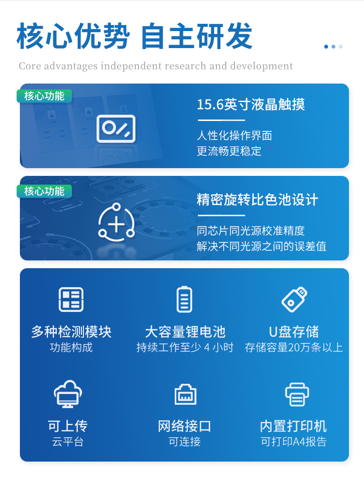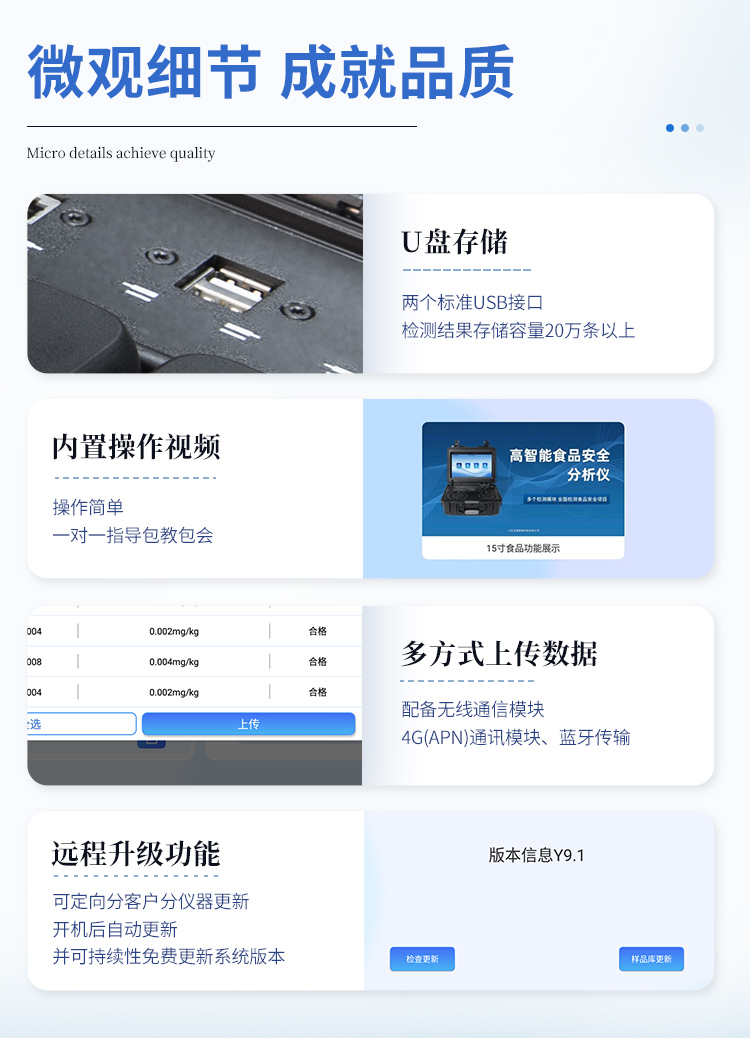 | 儀器采用手提一體化系統(tǒng)檢測技術(shù),將分光光度模塊、膠體金檢測模塊、新型農(nóng)殘檢測模塊、數(shù)字化管理模塊、無線通訊模塊高度集成于一體,支持檢測200種食品安全檢測項目,同時預(yù)留升級檢測方法。 | 儀器檢測模塊標(biāo)準(zhǔn)化、智能化,檢測項目可隨意自由組合。檢測箱體內(nèi)置多個標(biāo)準(zhǔn)檢測單元,檢測模塊可以調(diào)整配置。 | 顯示屏幕:儀器采用10.1英寸豎向液晶觸摸屏顯,搭配運行安卓智能操作系統(tǒng),主控芯片采用ARM Cortex-A7,RK3288/4核處理器,主頻1.88Ghz,操作方便,性能更強。 | 檢測通道:≥12通道;采用精密旋轉(zhuǎn)比色池設(shè)計,使用同芯片同光源校準(zhǔn)精度,解決不同光源之間的誤差值,更加準(zhǔn)確**。(1-12通道間誤差0.1%,**號:ZL202022821055.2) | 儀器光源:高精度進口四波長冷光源,每個通道均配置 410、520、590、630nm 波長光源,標(biāo)配**的光路切換裝置,**光路切換功能可實現(xiàn)64波長,并且所有檢測項目可實現(xiàn)所有通道同時檢測。 | 設(shè)備可一鍵校準(zhǔn),自動保存校準(zhǔn)數(shù)據(jù),自動對比校驗,得到精準(zhǔn)光源,采用Android SP存儲數(shù)據(jù),光源數(shù)據(jù)永不丟失,方便每一次使用。 | 通訊接口:配備無線通信模塊、4G(APN)通訊模塊、藍牙傳輸,同時具有雙USB接口以及RJ45網(wǎng)線接口,可以多方式實現(xiàn)數(shù)據(jù)保存及數(shù)據(jù)傳輸。 | 存儲方式:支持U盤存儲,標(biāo)準(zhǔn)USB接口,免驅(qū)動安裝。檢測結(jié)果存儲容量20萬條以上,可生成Excel表格進行拷貝,并具有登錄保護功能。 | 智能化操作系統(tǒng):: ★操作系統(tǒng):儀器可在同一檢測界面自動對應(yīng)相關(guān)檢測通道,一次性選擇1-12個樣品名稱,無需退出界面,節(jié)省操作時間。并可以對每個通道屬性和樣品信息單獨進行編輯,例如送檢單位、人員,檢測人員等,打印時勾選打印顯示。 | ★數(shù)據(jù)集成系統(tǒng):設(shè)備首頁自動匯總分析檢測數(shù)據(jù),包含:周檢測數(shù)據(jù)、月檢測數(shù)據(jù),全部檢測總數(shù)量,均包含檢測總數(shù),合格數(shù),不合格數(shù),以及相關(guān)柱形分析圖,各項檢測數(shù)據(jù)一目了然,無需電腦查詢,更加快捷直觀。 | ★數(shù)據(jù)庫系統(tǒng):十幾項數(shù)據(jù)庫分類管理儀器:包含項目類型、項目數(shù)據(jù)、檢測數(shù)據(jù)、歷史記錄、國標(biāo)信息、曲線信息、采樣信息、檢測信息、受檢信息、復(fù)核信息、圖表信息、光源校準(zhǔn)信息、打印樣式信息、樣品庫信息等等,數(shù)據(jù)庫之間互相協(xié)調(diào)聯(lián)動保證數(shù)據(jù)的真實完整性。同時產(chǎn)品數(shù)據(jù)庫以及歷史檢測記錄支持一鍵檢索功能。 | ★限量規(guī)判系統(tǒng):具有限量查詢、添加物質(zhì)合規(guī)判定系統(tǒng)。檢測出結(jié)果后,系統(tǒng)自動調(diào)用系統(tǒng)數(shù)據(jù)庫中相關(guān)國標(biāo)進行比對判定,客觀顯示判定結(jié)果是否合格 | ★項目預(yù)設(shè)系統(tǒng):儀器具有任務(wù)預(yù)設(shè)模塊,一鍵提前預(yù)設(shè),給出方便快捷的新檢測方案,每一個任務(wù)分別可以設(shè)置不同的樣品、批次、編號、來源、備注、抽樣信息、檢測信息、受檢信息、復(fù)核信息等更多信息。樣品送檢時一鍵調(diào)取保存信息,并可多次調(diào)取,大大提高檢測效率。 | ★數(shù)據(jù)監(jiān)管系統(tǒng):同步對接監(jiān)管平臺,數(shù)據(jù)可局域網(wǎng)和互聯(lián)網(wǎng)數(shù)據(jù)上傳,檢測結(jié)果可選擇直接傳至食品安全監(jiān)管平臺。進行區(qū)域食品安全監(jiān)管及大數(shù)據(jù)分析處理與數(shù)據(jù)統(tǒng)計,檢測區(qū)域食品安全長短期動態(tài),達到食品安全問題預(yù)估、預(yù)警。 | ★打印系統(tǒng):內(nèi)置全新打印機,新創(chuàng)自定義打印方式,可按需靈活勾選控制:產(chǎn)品合格證(國家農(nóng)業(yè)部標(biāo)準(zhǔn)要求),二維碼,抽樣信息、檢測信息,受檢信息、復(fù)核信息、抽樣日期、檢測日期等信息的打印。 | 供電模式:儀器交直流兩用,直流12V供電,可連接車載電源,可配6ah大容量充電鋰電池,電量可實時顯示,方便戶外流動測試。 | 膠體金檢測模塊:采用雙通道CMOS成像處理技術(shù)及膠體金免疫層析技術(shù),可同時讀取雙膠體金卡數(shù)據(jù),自動采集、處理分析,將檢測結(jié)果顯示,并可根據(jù)參考限值自動判斷檢測結(jié)果,可檢測常見的獸藥殘留、生物毒素、抗生素、違禁添加物等。 | ★探測技術(shù):CMOS成像探測; | ★檢測通道:1個通道; | ★檢測方式:消線法和比色法; | ★顯示模式:陰性或陽性; | 曲線形式:軌道式掃描方式,顯示金標(biāo)卡圖像,實時生成、識別CT曲線圖,無需手動調(diào)整,完成檢測后自動退出檢測卡。兼容市場上其他金標(biāo)卡,使用耗材不受限制。 | 儀器具備遠程升級功能,可定向分客戶分儀器更新,開機后自動更新,并可持續(xù)性免費更新系統(tǒng)版本,無需像傳統(tǒng)產(chǎn)品返廠更新,節(jié)省時間及人力成本并避免了物流運輸返廠升級導(dǎo)致設(shè)備損壞的潛在風(fēng)險。 |
