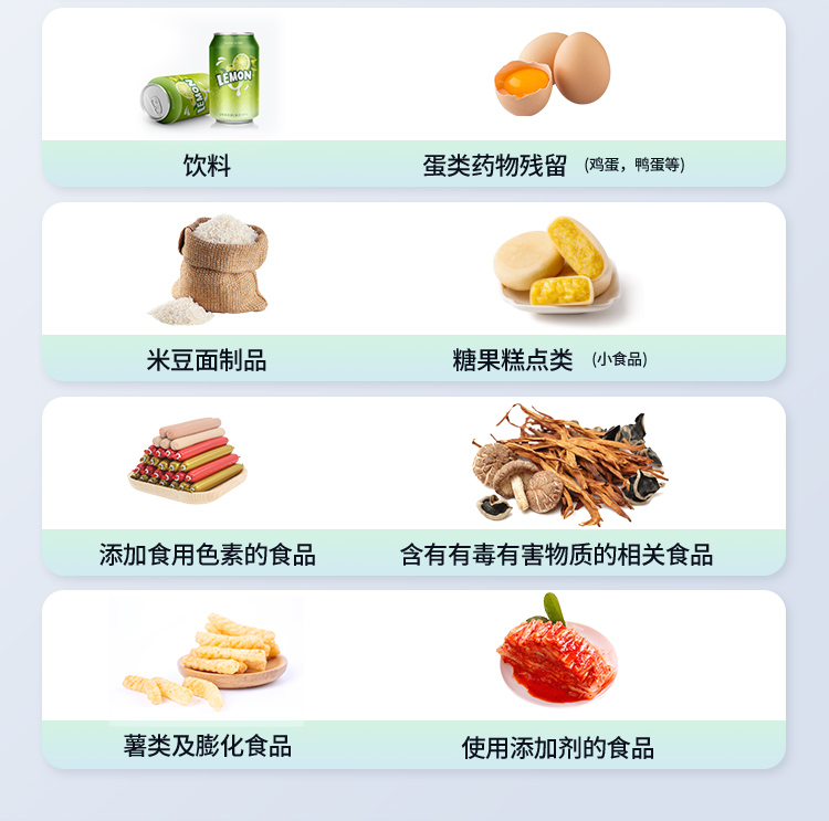 | 食品添加劑:二氧化硫、雙氧水、亞硝酸鹽、硝酸鹽、苯甲酸鈉、山梨酸鉀、糖精鈉、甜蜜素、木耳硫酸鎂等 | 有毒有害物質(zhì):甲醛、吊白塊、硼砂、過氧化苯甲酰、溴酸鉀、羅丹明B、三聚氰胺、蘇丹紅、工業(yè)堿、尿素、明礬等 | 果蔬:農(nóng)藥殘留(酶抑制率法) | 病害肉診斷:組胺、揮發(fā)性鹽基氮; | 重金屬含量:鉛、鎘、鉻、汞、砷、錫、鎳、鋁等; | 食用油脂: 過氧化值、酸價等 | 瘦肉精激素類(獸藥):鹽酸克倫特羅、沙丁胺醇、萊克多巴胺、己烯雌酚等 | 抗生素殘留類(獸藥):四環(huán)素類、硝基呋喃類、磺胺類、β-興奮劑類、沙星類、磺胺類、喹諾酮類,甲砜霉素,氟苯尼考,金剛烷胺、替米考星、慶大霉素、林可霉素、鏈霉素、恩諾沙星、環(huán)丙沙星、頭孢啦啶、青霉素、阿莫西林等 | 真菌毒素類:食用油、糧食及飼料中黃曲霉毒素B1、黃曲霉毒素總量,奶中黃曲霉毒素M1、嘔吐毒素、玉米赤霉烯酮、赭曲霉毒素A、T2毒素、伏馬毒素等; | 水酒飲品分析:酒中甲醇、乙醇、乳品及牛奶中蛋白質(zhì), | 調(diào)味品成分:食醋的總酸、醬油的總酸、芝麻油純度、谷氨酸鈉、醬油氨基酸態(tài)氮、食鹽中亞鐵氰化鉀、食鹽中碘等 | 食用色素類:紅色色素(胭脂紅、莧菜紅、赤蘚紅、誘惑紅)、黃色色素(檸檬黃、日落黃)、藍色色素(亮藍)等 | 動物疫病類:禽流感、新城疫、牛羊口蹄疫、牛羊結(jié)核病、牛羊包蟲、牛羊布病、小反芻獸、豬藍耳病毒、豬瘟病毒、豬偽狂犬病毒、豬細小、豬圓環(huán)、犬細小病毒、犬瘟熱病毒、犬狂犬病毒等; | 蜂蜜成分:果糖和葡萄糖、蔗糖、淀粉酶、酸度等 | 水產(chǎn)品安全類:孔雀石綠、氯霉素、呋喃妥因、呋喃西林、呋喃它酮、呋喃唑酮等 | 蛋類藥物殘留:氯霉素,四環(huán)素,磺胺類,喹諾酮類,呋喃西林,呋喃它酮,呋喃妥因,呋喃唑酮,氟苯尼考,阿莫西林、頭孢氨芐、紅霉素、鏈霉素等 |