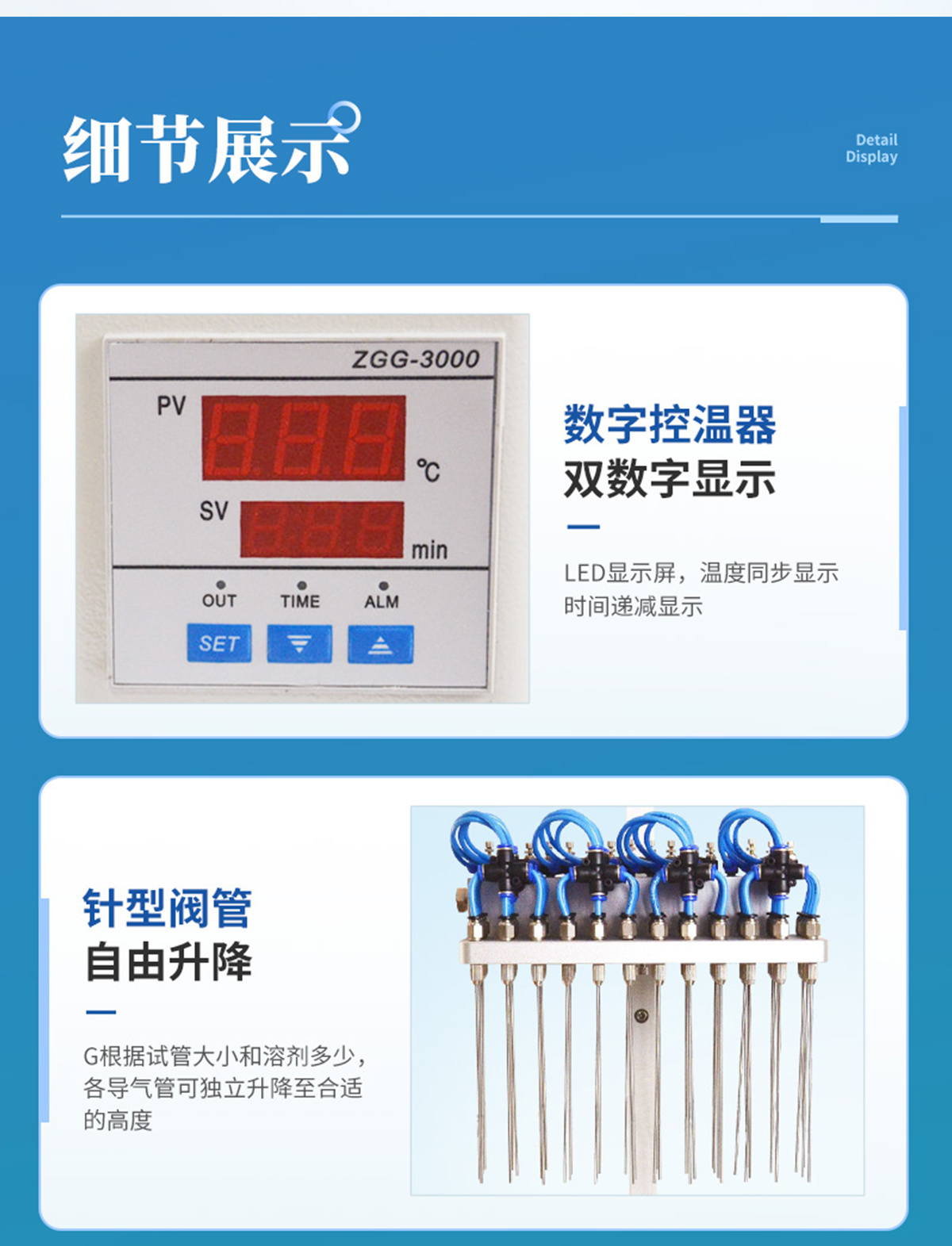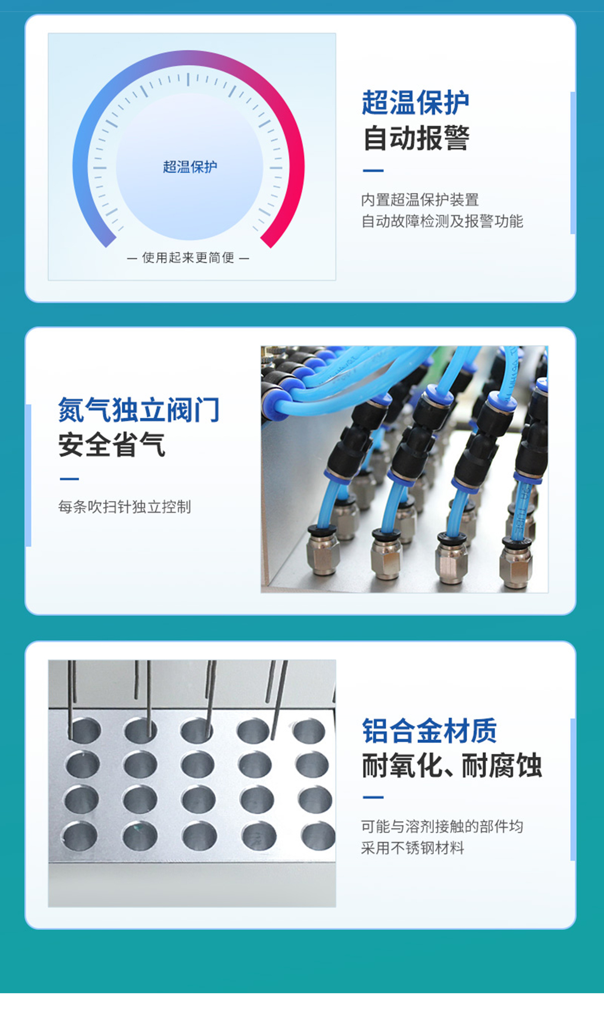| 分配室上各氣針通道可組合使用或單獨(dú)使用,每一路氣針均可單獨(dú)開(kāi)關(guān)。分配室的高度可視需要調(diào)節(jié)。 | 每一路氣體流量可單獨(dú)進(jìn)行調(diào)節(jié),克服了不可調(diào)氮吹儀各氣路氣流量大小不一的弱點(diǎn)。 | 數(shù)字溫控器,雙數(shù)字顯示. | 可能與溶劑接觸的部件均采用不銹鋼材料、合金鋁并表面進(jìn)行塑料噴涂,使用壽命長(zhǎng)且清潔方便。 | 整機(jī)可放入通風(fēng)櫥中使用。 | 一般標(biāo)配的加熱塊規(guī)格為孔徑∮16mm。 |