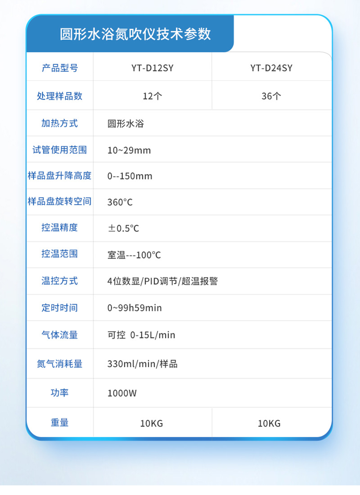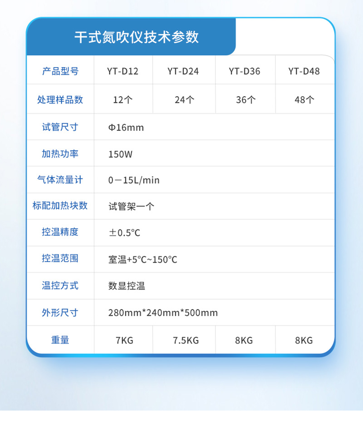 | YT-D12S | 12個(gè) | Ф16mm | 330ml/min/樣品(可調(diào)節(jié)) | 0-15L/min | 試管架一個(gè) | ±0.5℃ | 室溫---100℃ | 數(shù)顯控溫 | 340*200*460 | 600W | 7KG |