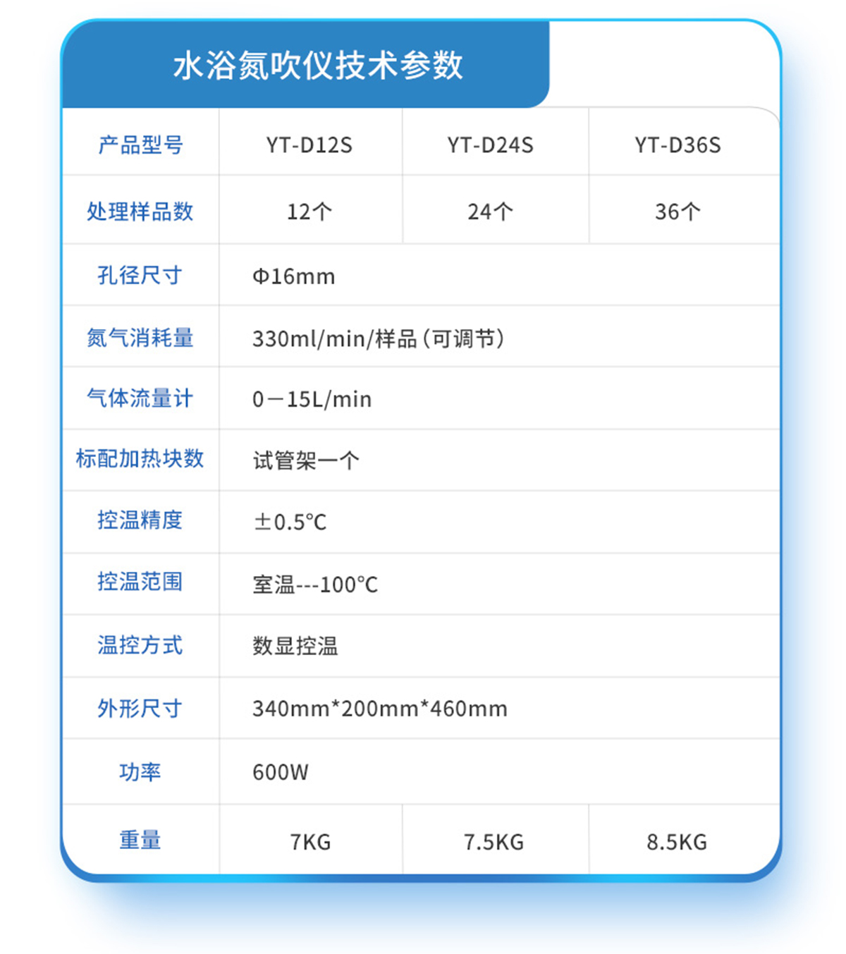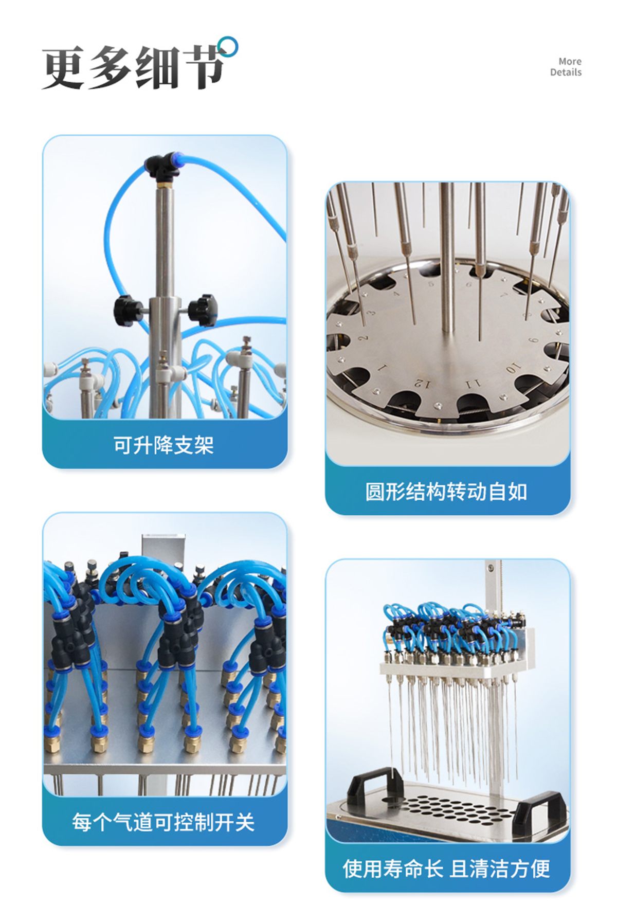| 每個吹針都可以獨立控制,避免引起交叉污染。 | 儀器氣腔高度可以自行調(diào)節(jié),配備標準氣針長度為15厘米。 | 氮吹儀有36個氣道控制開關,節(jié)約氣體,每根吹氣針的位置可獨立改變吹掃位置,使之適用不同的樣品容器及不同的樣品位置 | 在濃縮有毒溶劑時,整個系統(tǒng)可置于通風柜中,降低危險。 | 內(nèi)置超溫保護裝置,自動故障檢測及報警功能,方便實用。 | 儀器有LED顯示屏,溫度同步顯示、時間遞減顯示,可時時觀察溫度變化。 | 具有整體溫度更均勻,加熱速度快 | 本產(chǎn)品還可以作為普通的干式恒溫器使用 | 使用起來更簡便,而且溫度也可以達到150℃,可以更好濃縮樣品 |