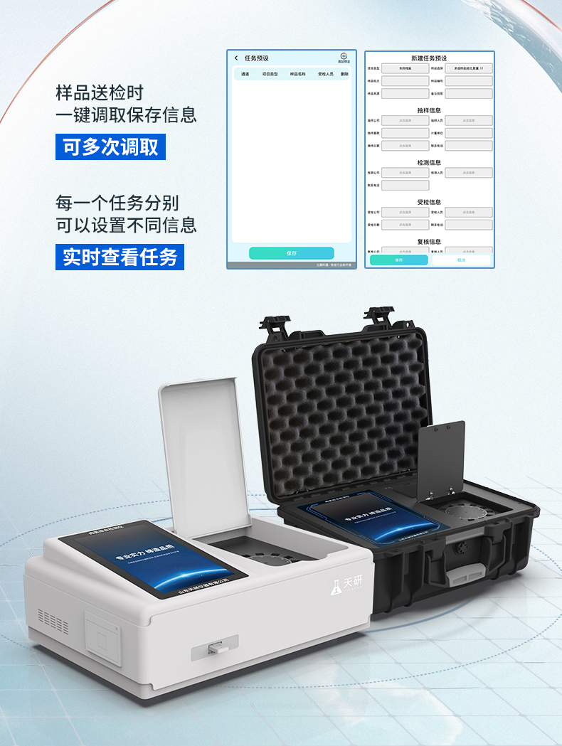| 儀器采用手提式一體化系統(tǒng)檢測技術(shù),將分光光度模塊、膠體金檢測模塊、新型農(nóng)殘檢測模塊、數(shù)字化管理模塊、無線通訊模塊高度集成于一體,支持檢測200種食品安全檢測項(xiàng)目,同時(shí)預(yù)留升級檢測方法。 | 儀器檢測模塊標(biāo)準(zhǔn)化、智能化,檢測項(xiàng)目可隨意自由組合。檢測箱體內(nèi)置多個(gè)標(biāo)準(zhǔn)檢測單元,檢測模塊可以調(diào)整配置。 | 顯示屏幕:儀器采用10.1英寸豎向液晶觸摸屏顯,搭配運(yùn)行安卓智能操作系統(tǒng),主控芯片采用ARM Cortex-A7,RK3288/4核處理器,主頻1.88Ghz,操作方便,性能更強(qiáng)。 | 檢測通道:≥12通道;采用精密旋轉(zhuǎn)比色池設(shè)計(jì),使用同芯片同光源校準(zhǔn)精度,解決不同光源之間的誤差值,更加準(zhǔn)確**。(1-12通道間誤差0.1%,**號:ZL202022821055.2) | 儀器光源:高精度進(jìn)口四波長冷光源,每個(gè)通道均配置 410、520、590、630nm 波長光源,標(biāo)配**的光路切換裝置,**光路切換功能可實(shí)現(xiàn)64波長,并且所有檢測項(xiàng)目可實(shí)現(xiàn)所有通道同時(shí)檢測。 | 設(shè)備可一鍵校準(zhǔn),自動(dòng)保存校準(zhǔn)數(shù)據(jù),自動(dòng)對比校驗(yàn),得到精準(zhǔn)光源,采用Android SP存儲數(shù)據(jù),光源數(shù)據(jù)永不丟失,方便每一次使用。 | 通訊接口:配備無線通信模塊、4G(APN)通訊模塊、藍(lán)牙傳輸,同時(shí)具有雙USB接口以及RJ45網(wǎng)線接口,可以多方式實(shí)現(xiàn)數(shù)據(jù)保存及數(shù)據(jù)傳輸 | 存儲方式:支持U盤存儲,標(biāo)準(zhǔn)USB接口,免驅(qū)動(dòng)安裝。檢測結(jié)果存儲容量20萬條以上,可生成Excel表格進(jìn)行拷貝,并具有登錄保護(hù)功能。 | 智能化操作系統(tǒng): | 1)操作系統(tǒng):儀器可在同一檢測界面自動(dòng)對應(yīng)相關(guān)檢測通道,一次性選擇1-12個(gè)樣品名稱,無需退出界面,節(jié)省操作時(shí)間。并可以對每個(gè)通道屬性和樣品信息單獨(dú)進(jìn)行編輯,例如送檢單位、人員,檢測人員等,打印時(shí)勾選打印顯示。 | 2)數(shù)據(jù)集成系統(tǒng):設(shè)備首頁自動(dòng)匯總分析檢測數(shù)據(jù),包含:周檢測數(shù)據(jù)、月檢測數(shù)據(jù),全部檢測總數(shù)量,均包含檢測總數(shù),合格數(shù),不合格數(shù),以及相關(guān)柱形分析圖,各項(xiàng)檢測數(shù)據(jù)一目了然,無需電腦查詢,更加快捷直觀。 | 3)數(shù)據(jù)庫系統(tǒng):十幾項(xiàng)數(shù)據(jù)庫分類管理儀器:包含項(xiàng)目類型、項(xiàng)目數(shù)據(jù)、檢測數(shù)據(jù)、歷史記錄、國標(biāo)信息、曲線信息、采樣信息、檢測信息、受檢信息、復(fù)核信息、圖表信息、光源校準(zhǔn)信息、打印樣式信息、樣品庫信息等等,數(shù)據(jù)庫之間互相協(xié)調(diào)聯(lián)動(dòng)保證數(shù)據(jù)的真實(shí)完整性。同時(shí)產(chǎn)品數(shù)據(jù)庫以及歷史檢測記錄支持一鍵檢索功能。 | 4)限量規(guī)判系統(tǒng):具有限量查詢、添加物質(zhì)合規(guī)判定系統(tǒng)。檢測出結(jié)果后,系統(tǒng)自動(dòng)調(diào)用系統(tǒng)數(shù)據(jù)庫中相關(guān)國標(biāo)進(jìn)行比對判定,客觀顯示判定結(jié)果是否合格。 | 5)項(xiàng)目預(yù)設(shè)系統(tǒng):儀器具有任務(wù)預(yù)設(shè)模塊,一鍵提前預(yù)設(shè),給出方便快捷的新檢測方案,每一個(gè)任務(wù)分別可以設(shè)置不同的樣品、批次、編號、來源、備注、抽樣信息、檢測信息、受檢信息、復(fù)核信息等更多信息。樣品送檢時(shí)一鍵調(diào)取保存信息,并可多次調(diào)取,大大提高檢測效率。 | 6)數(shù)據(jù)監(jiān)管系統(tǒng):同步對接監(jiān)管平臺,數(shù)據(jù)可局域網(wǎng)和互聯(lián)網(wǎng)數(shù)據(jù)上傳,檢測結(jié)果可選擇直接傳至食品安全監(jiān)管平臺。進(jìn)行區(qū)域食品安全監(jiān)管及大數(shù)據(jù)分析處理與數(shù)據(jù)統(tǒng)計(jì),檢測區(qū)域食品安全長短期動(dòng)態(tài),達(dá)到食品安全問題預(yù)估、預(yù)警。 | 7)打印系統(tǒng):內(nèi)置全新打印機(jī),新創(chuàng)自定義打印方式,可按需靈活勾選控制:產(chǎn)品合格證(國家農(nóng)業(yè)部標(biāo)準(zhǔn)要求),二維碼,抽樣信息、檢測信息,受檢信息、復(fù)核信息、抽樣日期、檢測日期等信息的打印。 | 供電模式:儀器交直流兩用,直流12V供電,可連接車載電源,可配6ah大容量充電鋰電池,電量可實(shí)時(shí)顯示,方便戶外流動(dòng)測試。 | 膠體金檢測模塊:采用雙通道CMOS成像處理技術(shù)及膠體金免疫層析技術(shù),可同時(shí)讀取雙膠體金卡數(shù)據(jù),自動(dòng)采集、處理分析,將檢測結(jié)果顯示,并可根據(jù)參考限值自動(dòng)判斷檢測結(jié)果,可檢測常見的獸藥殘留、生物毒素、抗生素、違禁添加物等。 | 1)探測技術(shù):CMOS成像探測; | 2)檢測通道:1個(gè)通道; | 3)檢測方式:消線法和比色法; | 4)顯示模式:陰性或陽性; | 5)曲線形式:軌道式掃描方式,顯示金標(biāo)卡圖像,實(shí)時(shí)生成、識別CT曲線圖,無需手動(dòng)調(diào)整,完成檢測后自動(dòng)退出檢測卡。兼容市場上其他金標(biāo)卡,使用耗材不受限制。 | 儀器加入遠(yuǎn)程升級功能,可定向分客戶分儀器更新,開機(jī)后自動(dòng)更新,客戶無需任何操作,即可升級全新