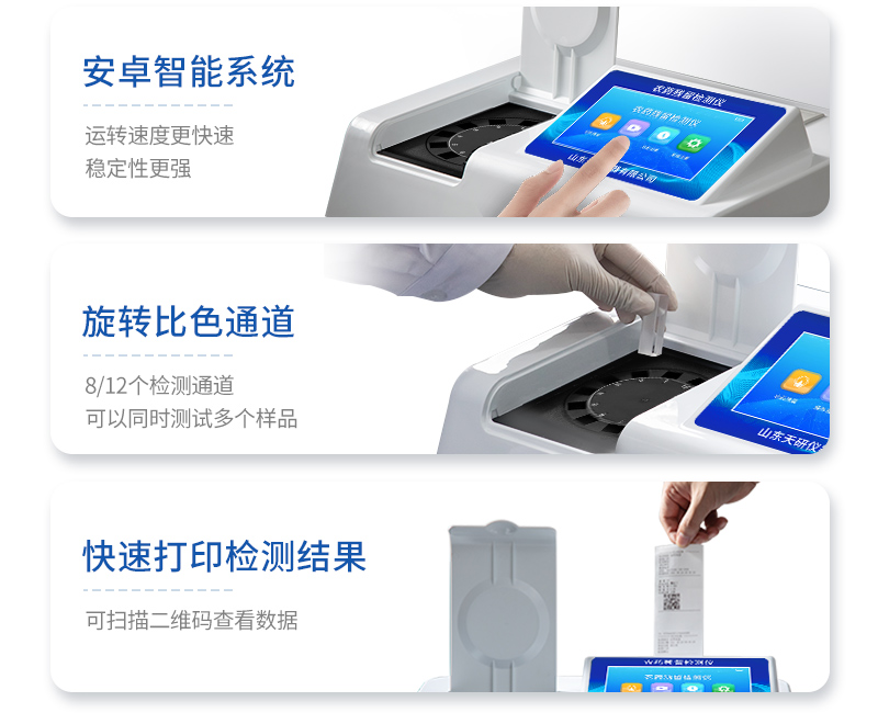 | 安卓智能操作系統(tǒng),采用更加**和人性化操作,儀器具有無(wú)線聯(lián)網(wǎng)上傳功能,快速上傳數(shù)據(jù),進(jìn)行數(shù)據(jù)統(tǒng)計(jì)和分析。 | 智能化程度高,儀器具有自檢功能:具有開(kāi)機(jī)自檢和調(diào)零功能,具有自動(dòng)檢測(cè)重復(fù)性功能;同時(shí),檢測(cè)完成可自動(dòng)打印檢測(cè)報(bào)告和二維碼。手機(jī)掃碼可顯示出詳細(xì)檢測(cè)信息。 | 儀器帶有監(jiān)管平臺(tái),數(shù)據(jù)可局域網(wǎng)和互聯(lián)網(wǎng)數(shù)據(jù)上傳,檢測(cè)結(jié)果直接傳至食品安全監(jiān)管平臺(tái)。進(jìn)行區(qū)域食品安全監(jiān)管及大數(shù)據(jù)分析處理與數(shù)據(jù)統(tǒng)計(jì),檢測(cè)區(qū)域食品安全長(zhǎng)短期動(dòng)態(tài),達(dá)到食品安全問(wèn)題預(yù)估、預(yù)警 。 | 樣品處理簡(jiǎn)單省力,整體操作快速、安全、便捷。 | 儀器具有自身保護(hù)功能,可設(shè)置用戶(hù)名及密碼,防止非工作人員操作等。 | 內(nèi)置強(qiáng)大的數(shù)據(jù)庫(kù),可在儀器上直接選擇樣品名稱(chēng)、檢測(cè)指標(biāo)、送檢單位等信息,也可在儀器上直接編輯錄入樣品名稱(chēng)、檢測(cè)指標(biāo)、送檢單位等信息并保存進(jìn)樣品數(shù)據(jù)庫(kù),方便后期操作調(diào)取使用。 | 儀器具有重新校準(zhǔn)、鎖定、恢復(fù)出廠設(shè)置功能。 |