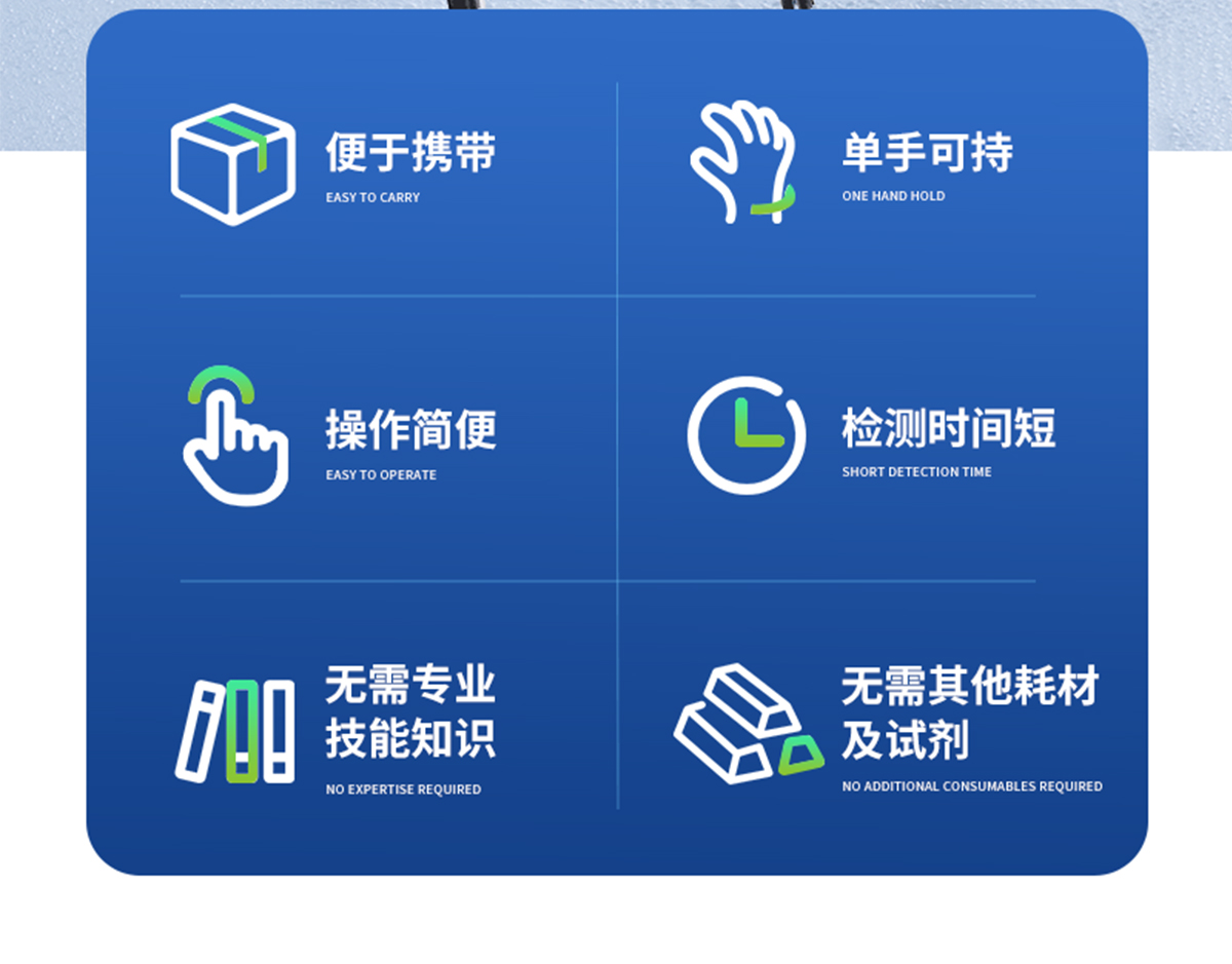 | 便于攜帶,單手可持 | 可根據(jù)測(cè)定對(duì)象的品種,設(shè)定相應(yīng)的判斷標(biāo)準(zhǔn)值 | 操作簡(jiǎn)便,檢測(cè)人員無(wú)需專業(yè)技能知識(shí) | 檢測(cè)時(shí)間短,每個(gè)樣品2分鐘內(nèi)出結(jié)果; | 檢測(cè)試驗(yàn)無(wú)需其他耗材及試劑 |