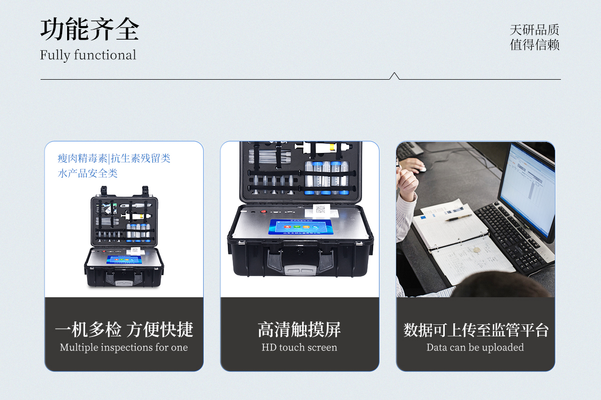 | 安卓智能操作系統(tǒng),采用更加**和人性化操作,儀器具有網(wǎng)線連接、wifi聯(lián)網(wǎng)上傳、4G無(wú)線遠(yuǎn)傳功能,快速上傳數(shù)據(jù)。 | 智能化程度高,儀器具有自檢功能:具有開(kāi)機(jī)自檢和調(diào)零功能,具有自動(dòng)檢測(cè)重復(fù)性功能。 | 新一代高速熱敏打印機(jī),檢測(cè)完成可自動(dòng)打印檢測(cè)報(bào)告和二維碼。 | 儀器帶有監(jiān)管平臺(tái)。數(shù)據(jù)可局域網(wǎng)和互聯(lián)網(wǎng)數(shù)據(jù)上傳,檢測(cè)結(jié)果直接傳至食品安全監(jiān)管平臺(tái)。進(jìn)行區(qū)域食品安全監(jiān)管及大數(shù)據(jù)分析處理與數(shù)據(jù)統(tǒng)計(jì),檢測(cè)區(qū)域食品安全長(zhǎng)短期動(dòng)態(tài),達(dá)到食品安全問(wèn)題預(yù)估、預(yù)警。 | 一體化便攜式快檢設(shè)備,滿足現(xiàn)場(chǎng)及流動(dòng)檢測(cè)使用需求,能夠在同一軟件下實(shí)現(xiàn)所有檢測(cè)項(xiàng)目的檢測(cè),并可通過(guò)同一窗口直觀顯示檢測(cè)結(jié)果。 | 膠體金模塊檢測(cè)方式:軌道式自動(dòng)傳輸掃描,檢測(cè)完成后自動(dòng)退出檢測(cè)卡。 | CT線自動(dòng)識(shí)別,無(wú)需手動(dòng)調(diào)整。 | 儀器具有品類多種類樣品菜單庫(kù),可靈活選擇檢測(cè)樣品,不同的檢測(cè)通道可同時(shí)檢測(cè)不同的樣品項(xiàng)目。 | 樣品處理簡(jiǎn)單省力,整體操作快速、安全、便捷。 | 儀器具有自身保護(hù)功能,可設(shè)置用戶名及密碼,防止非工作人員操作等。 | 高靈敏度,高檢測(cè)精度,高重復(fù)性精度,掃描式高精度光學(xué)傳感器。 | 內(nèi)置強(qiáng)大的數(shù)據(jù)庫(kù),可在儀器上直接選擇樣品名稱、檢測(cè)指標(biāo)、送檢單位等信息,也可在儀器上直接編輯錄入樣品名稱、檢測(cè)指標(biāo)、送檢單位等信息并保存進(jìn)樣品數(shù)據(jù)庫(kù)。 | 儀器具有重新校準(zhǔn)、鎖定、恢復(fù)出廠設(shè)置功能。 | 支持U盤存儲(chǔ)。 結(jié)果判定線可修改,對(duì)照值標(biāo)定值可保存,斷電不丟失數(shù)據(jù)。 | 兼容市場(chǎng)上所有的膠體金卡,使用耗材不受限制,極大增強(qiáng)用戶使用體驗(yàn)。 |