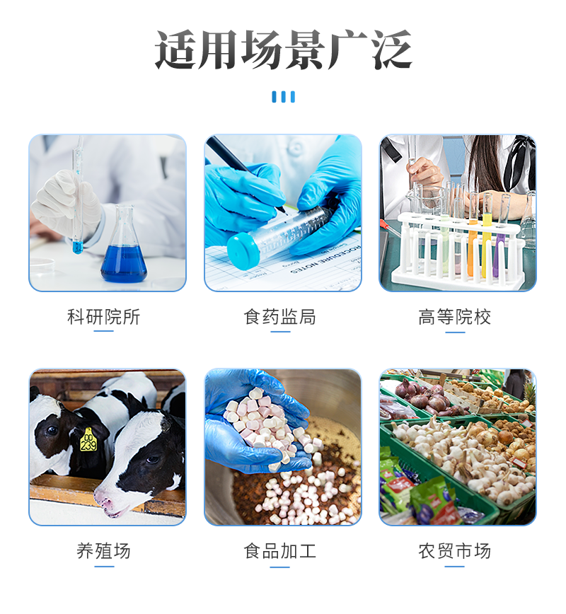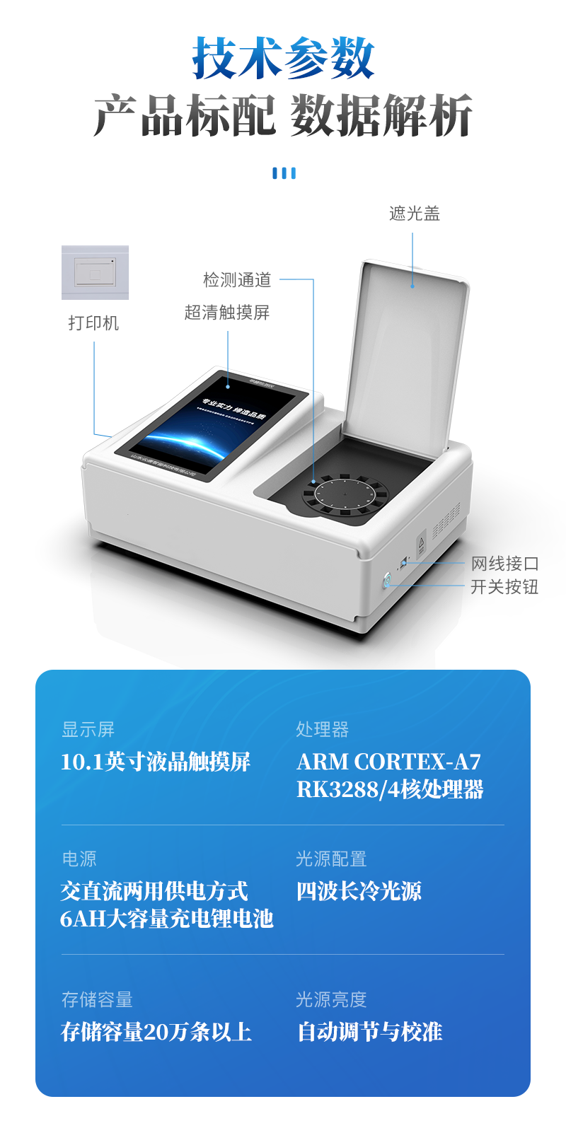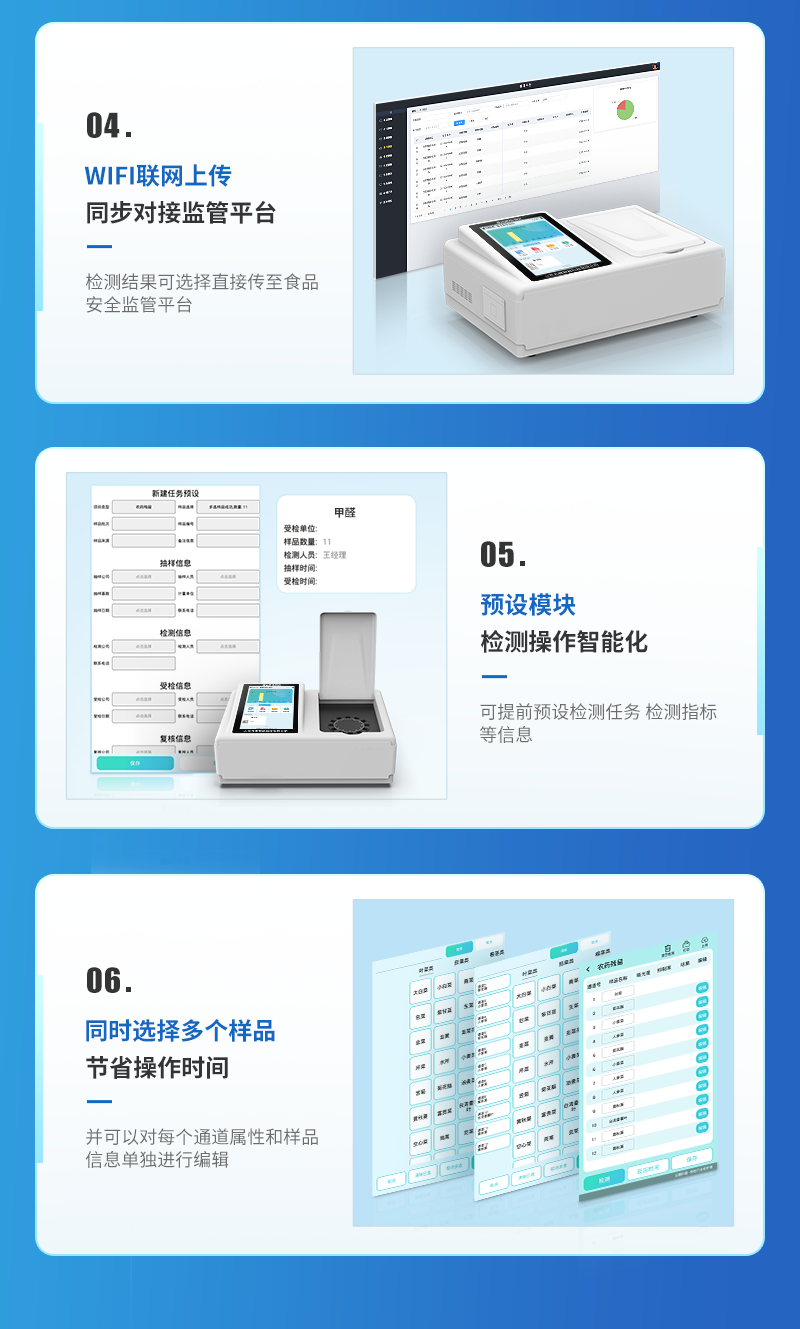 | 儀器采用臺式一體化系統(tǒng)檢測技術(shù),將分光光度模塊、新型農(nóng)殘檢測模塊、數(shù)字化管理模塊、無線通訊模塊高度集成于一體,支持檢測200種食品安全檢測項目,同時預留升級檢測方法。 | 儀器檢測模塊標準化、智能化,可隨意自由組合。檢測箱體內(nèi)置多個標準檢測單元,檢測模塊可以調(diào)整配置。 | 儀器采用全新安卓智能系統(tǒng),主控芯片采用 ARM Cortex-A7,RK3288/4核處理器,10.1寸高清液晶觸摸豎屏,更加**的UI交互界面,運轉(zhuǎn)快捷;儀器配備無線通信模塊: 4G(APN)通訊模塊、Wifi模塊,藍牙傳輸,同時具有雙USB接口以及RJ45接口能以多種方式實現(xiàn)數(shù)據(jù)保存和數(shù)據(jù)傳輸功能。 | 創(chuàng)新檢測模式: | ★檢測通道:≥12通道;采用精密旋轉(zhuǎn)比色池設(shè)計,使用同芯片同光源校準精度,解決不同光源之間的誤差值。1-12通道間誤差0.1%。(**號:ZL202022821055.2) | ★儀器具有自動識別比色皿檢測功能,即:將樣品比色皿放入儀器后,點擊樣品檢測,儀器自動識別比色皿進行通道檢測。 | 進口高精光源: | 高精度進口四波長冷光源,通道配置 410、520、590、630nm 波長光源,一個光源芯片驅(qū)動一個光源,誤差極小,每臺設(shè)備單獨**校準光源,**比對,同時參照四種不同波段光源全方位覆蓋市面上99%的農(nóng)殘食品項目檢測。 | 智能化操作系統(tǒng): | 便捷操作系統(tǒng):設(shè)備檢測時可在同一檢測界面自動對應(yīng)相關(guān)檢測通道一次性選擇1-12個樣品名稱,無須退出界面,節(jié)省操作時間。 | 數(shù)據(jù)集成系統(tǒng):設(shè)備首頁自動統(tǒng)計檢測數(shù)據(jù)包含:周檢測數(shù)據(jù)、月檢測數(shù)據(jù),全部檢測總數(shù)量,均包含檢測總數(shù),合格數(shù),不合格數(shù),以及相關(guān)柱形分析圖,對各項檢測數(shù)據(jù)清晰掌握,無需電腦查詢,更加快捷直觀。 | 項目預設(shè)系統(tǒng):支持添加單個及多個相同或不相同的任務(wù)預設(shè),一鍵快速調(diào)取,每一個任務(wù)分別可以設(shè)置不同的樣品、批次、編號、來源、備注、抽樣信息、檢測信息、受檢信息、復核信息等更多信息。無縫鏈接平臺和APP實時查看下發(fā)任務(wù)。 | 數(shù)據(jù)監(jiān)管系統(tǒng):同步對接監(jiān)管平臺,數(shù)據(jù)可局域網(wǎng)和互聯(lián)網(wǎng)數(shù)據(jù)上傳,檢測結(jié)果可選擇直接傳至食品安全監(jiān)管平臺。集成OSS輸出存儲服務(wù)、區(qū)分設(shè)備定向管理應(yīng)用,進行區(qū)域食品安全監(jiān)管及大數(shù)據(jù)分析處理與數(shù)據(jù)統(tǒng)計,檢測區(qū)域食品安全長短期動態(tài),達到食品安全問題預估、預警。 | 自定義打印系統(tǒng):內(nèi)置全新打印系統(tǒng),新創(chuàng)自定義打印方式,可按需靈活設(shè)置開啟或關(guān)閉:產(chǎn)品合格證(國家農(nóng)業(yè)部標準要求),二維碼,抽樣信息、檢測信息,受檢信息、復核信息、抽樣日期、檢測日期等信息的打印。 | 系統(tǒng)遠程更新功能:可定向分客戶分儀器更新系統(tǒng),按照不同客戶后期實際需求添加項目,無需機器返廠,即可遠程實時升級全新系統(tǒng),節(jié)省時間成本及避免運輸造成設(shè)備損壞。 | 儀器主機采用一體化防水、抗壓、防撞擊、防腐蝕箱體設(shè)計,同時配備交直流供電,可連接車載電源,可選配大容量充電鋰電池,滿足現(xiàn)場野外檢測需求。 | 安全證書,放心保障:儀器具有中國計量科學研究院校準證書,**認證。 |