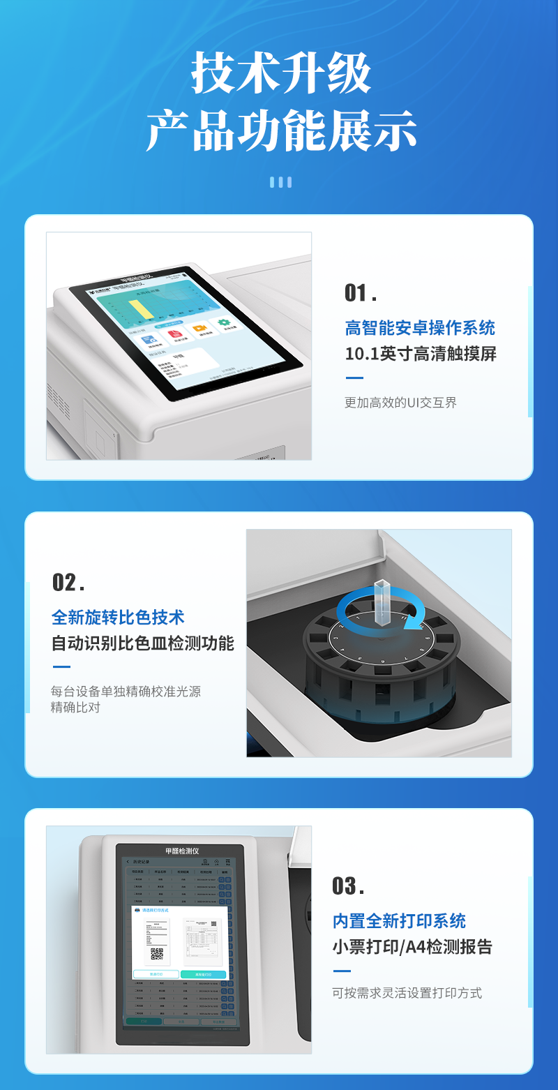 可快速定量檢測各類食品中的甲醛的含量,儀器預留其他項目檢測程序和端口,根據(jù)日后需求可方便的自主增加檢測項目。日后可升級為檢測,水產(chǎn)品,肉制品,面制品的綜合類型儀器。