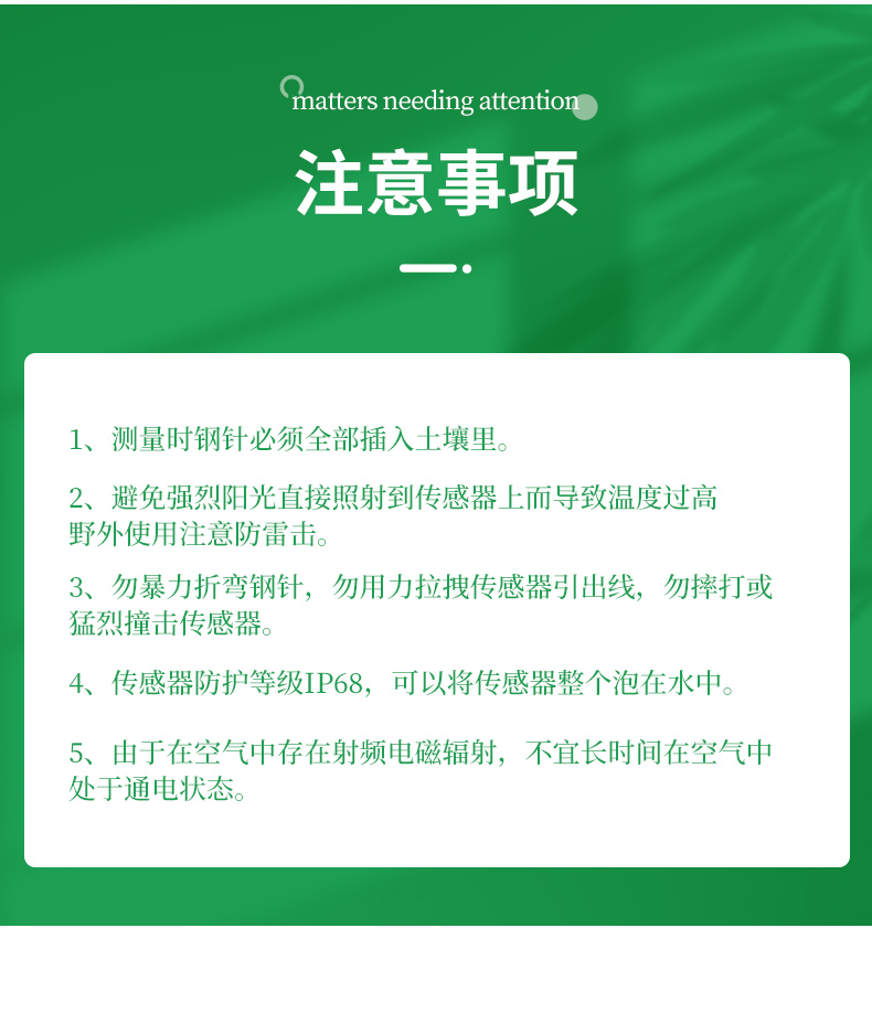 | (1)土壤含水率、電導(dǎo)率以及溫度三參數(shù)合一。 | (2)也可用于水肥一體溶液、以及其他營養(yǎng)液與基質(zhì)的電導(dǎo)率。 | (3)電極采用特殊處理的合金材料,可承受較強(qiáng)的外力沖擊,不易損壞。 | (4)完全密封,耐酸堿腐蝕,可埋入土壤或直接投入水中進(jìn)行長期動(dòng)態(tài)檢測。 | (5)精度高,響應(yīng)快,互換性好,探針插入式設(shè)計(jì)保證測量**,性能可靠。 | (6)完善的保護(hù)電路與多種信號(hào)輸出接口可選。 |