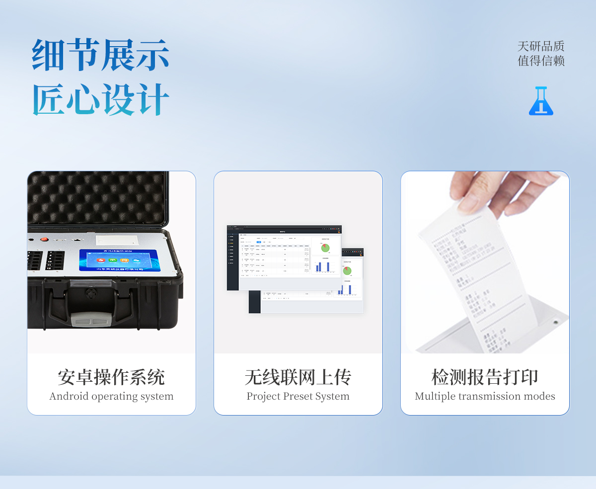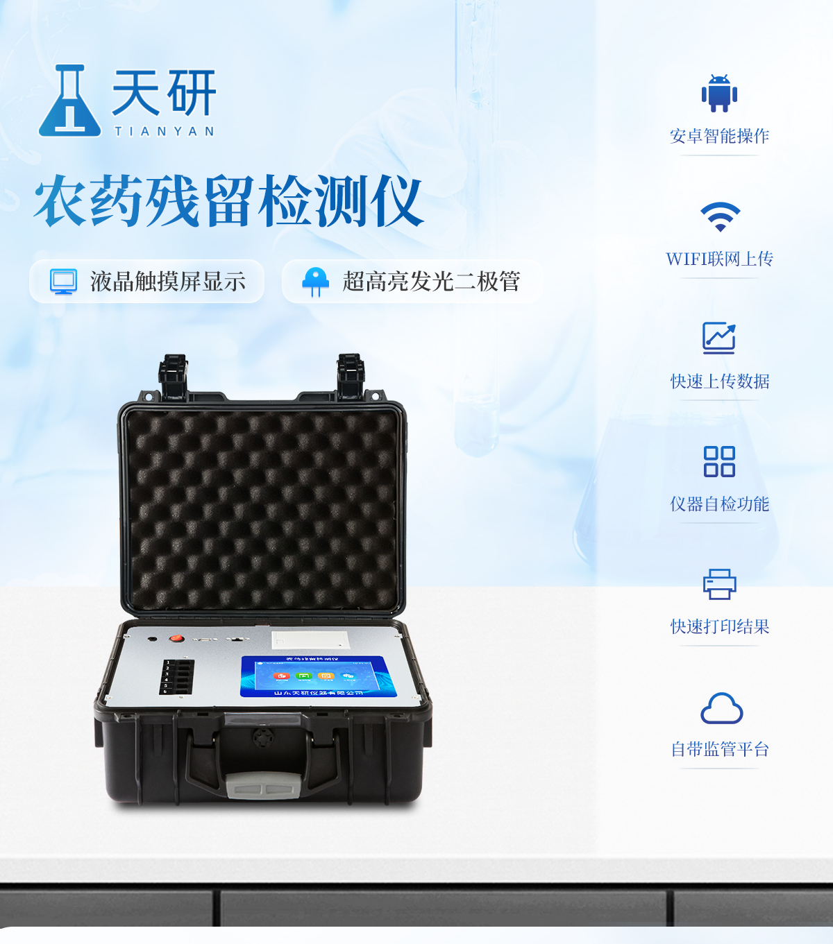 | 機箱采用工業(yè)級ABS工程塑料箱,方便攜帶,穩(wěn)固耐用,便于流動測試。 | 智能操作系統(tǒng),采用更加人性化操作,主控采用多核處理器,主頻1.88Ghz,運轉(zhuǎn)速度更快速,穩(wěn)定性更強。 | 自動判斷樣品是否合格,檢測結(jié)果更加直觀。 | 儀器具有100多種蔬菜名稱菜單庫,分類管理,并可按需添加或刪除蔬菜名,編輯蔬菜名稱,可直接打印出蔬菜名稱。 | 檢測通道:18個檢測通道,可以同時測試多個樣品,循環(huán)檢測,即放即檢,每個樣品由程序控制分別獨立工作,不會互相干擾。 | 儀器具有wifi聯(lián)網(wǎng)功能,可將數(shù)據(jù)快速上傳電腦,進(jìn)行數(shù)據(jù)管理與統(tǒng)計,4G信號GPRS遠(yuǎn)傳功能,可插手機卡實現(xiàn)數(shù)據(jù)遠(yuǎn)傳平臺,。 | 顯示方式:7英寸高靈敏真彩觸摸屏顯示,人性化中文操作界面,讀數(shù)直觀、簡單。 | 打印機采用串口5v打印,可選擇手動打印或者自動打印,三分鐘出打印結(jié)果,打印格式為檢測人姓名、吸光度差值、檢測時間、檢測機構(gòu)、樣品名稱及結(jié)果判定。 | 光源采用進(jìn)口超高亮發(fā)光二極管,具有低功耗、高精度、穩(wěn)定性強、光源可控可以關(guān)掉不使用的光源,響應(yīng)速度快等優(yōu)點。 | 智能恒流穩(wěn)壓,光強自動校準(zhǔn),長時間連續(xù)工作光源無溫漂現(xiàn)象。 | 采用USB2.0接口設(shè)計,方便數(shù)據(jù)的存貯和移動,并可隨時與計算機直接相連,并且可用計算機控制儀器。實現(xiàn)數(shù)據(jù)查詢、瀏覽、分析、統(tǒng)計、打印等。 | 智能化程度高,儀器具有自檢功能:具有開機自檢和調(diào)零功能,具有自動檢測重復(fù)性功能 | 儀器具有自身保護(hù)功能,可設(shè)置用戶名及密碼,防止非工作人員操作等。 | 采用DC12v直流供電,安全系統(tǒng)更高,并且配備6A鋰電池充電器。 | 儀器具有重新校準(zhǔn)、鎖定、恢復(fù)出廠設(shè)置功能。 |
