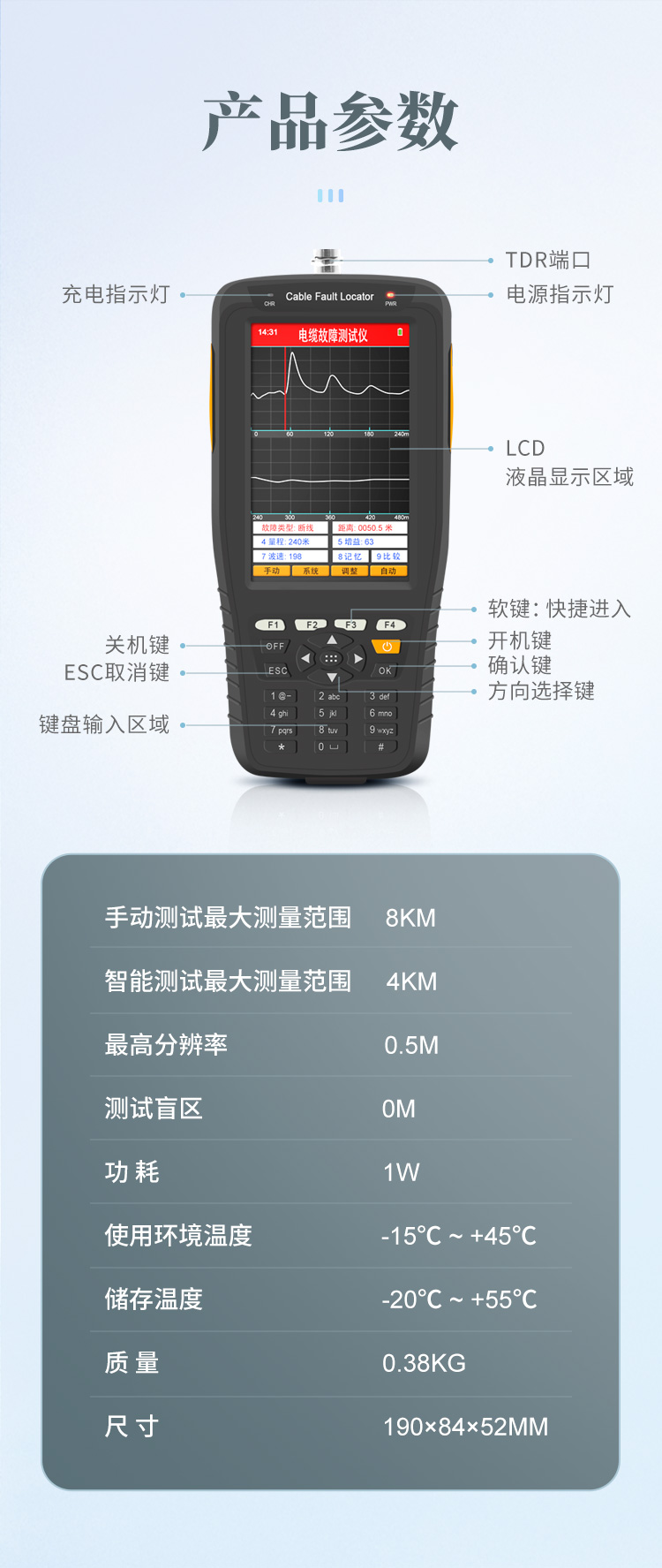 | 手動測試**測量范圍 8Km | 智能測試**測量范圍 4Km | **分辨率 0.5m | 測試盲區(qū) 0m | 功耗 1W | 質(zhì)量 0.38KG | 體積 190×84×52mm3 | 使用環(huán)境溫度 -15℃ ~ +45℃ | 儲存溫度 -20℃ ~ +55℃ |