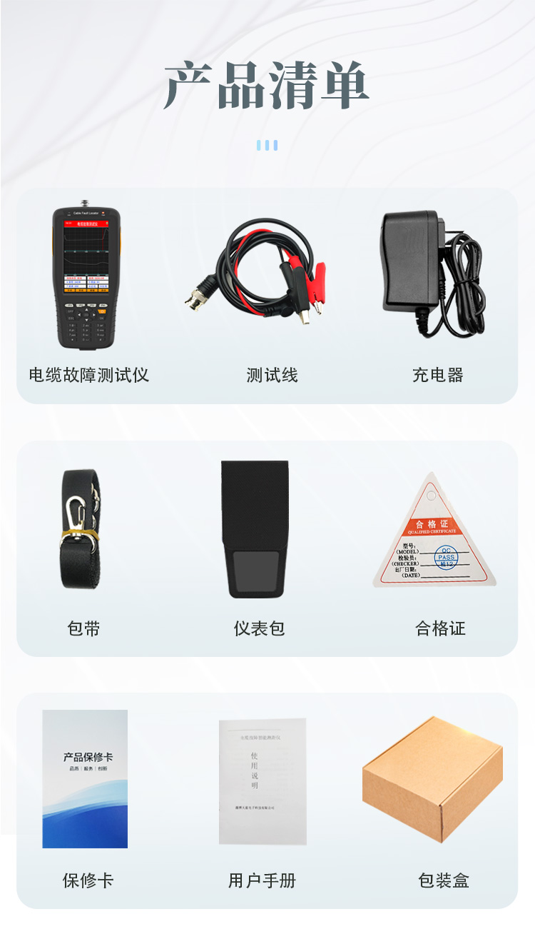 | 電纜故障測試儀......1 | 測試線X......1 | 充電器......1 | 包帶......1 | 儀表包......1 | 合格證......1 | 保修卡......1 | 用戶手冊......1 | 包裝盒......1 |