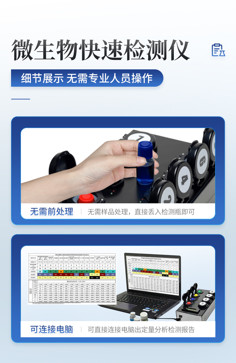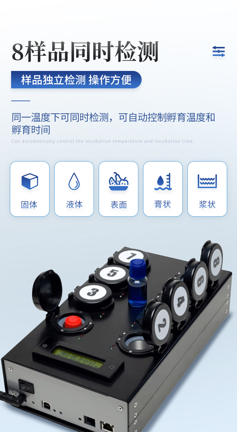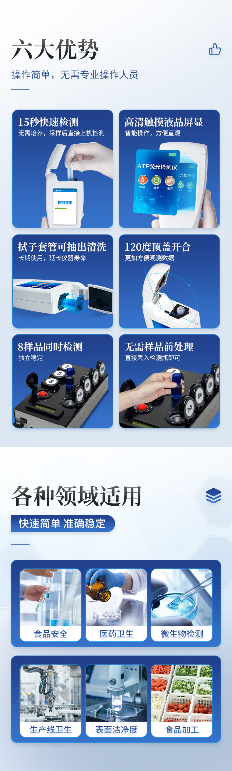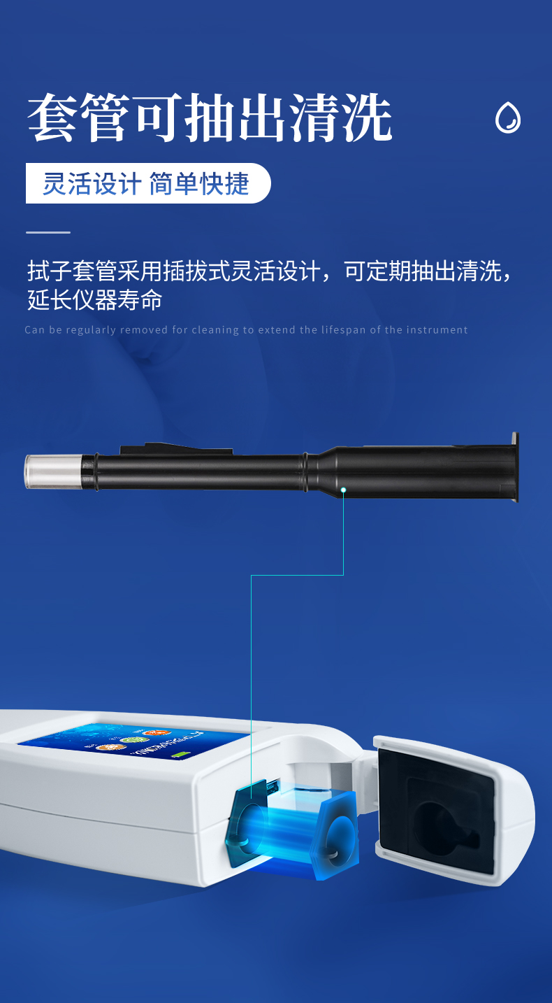 | 實用性 —— 可根據(jù)環(huán)境檢測需求設(shè)定上下限值,做到數(shù)據(jù)快速評估預(yù)警,表面潔凈度快速篩查。 | 速度快 —— 常規(guī)培養(yǎng)法18-24h以上,而ATP只需要十幾秒鐘 . | 可行性 —— 微生物數(shù)量與微生物體內(nèi)所含ATP有明確的相關(guān)性。 通過檢測ATP含量,可間接得出反應(yīng)中微生物數(shù)量 | 可操作性 —— 傳統(tǒng)培養(yǎng)方法需要在實驗室由經(jīng)過培訓(xùn)的技術(shù)人員進行操作;而ATP快速潔凈度檢測操作非常簡便,只需簡單的培訓(xùn)即可由一般工作人員進行現(xiàn)場操作。 | 體驗更好 —— 試子套管采用插拔式靈活設(shè)計,可定期清洗長期使用,延長儀器壽命。 |