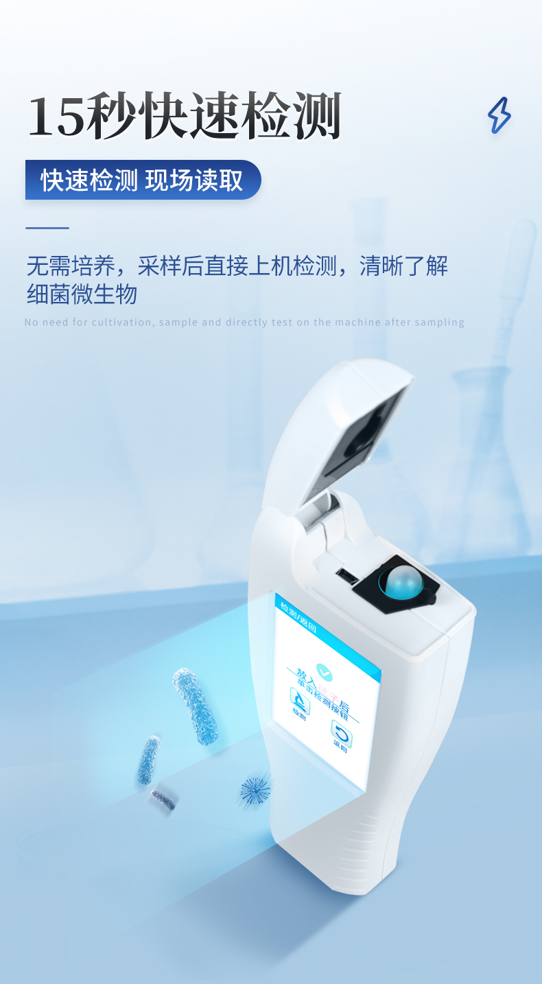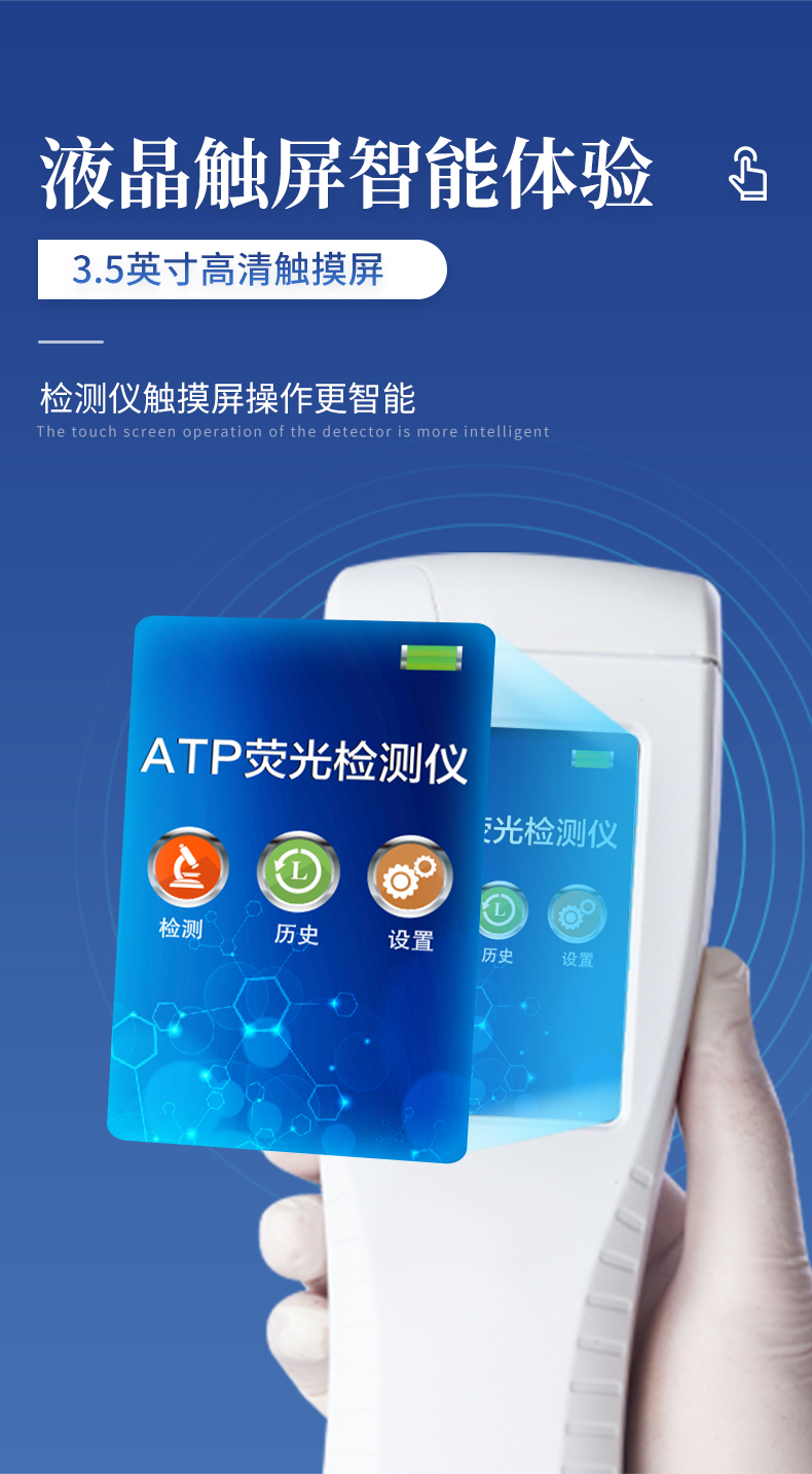 該設(shè)備為全新升級產(chǎn)品,大屏幕觸摸顯示屏,代替?zhèn)鹘y(tǒng)按鍵。操作采用生物化學(xué)反應(yīng)方法檢測ATP含量,ATP熒光檢測儀基于螢火蟲發(fā)光原理,利用“熒光素酶—熒光素體系”快速檢測三磷酸腺苷(ATP)。ATP拭子含有可以裂解細胞膜的試劑,能將細胞內(nèi)ATP釋放出來,與試劑中含有的特異性酶發(fā)生反應(yīng),產(chǎn)生光,再用熒光照度計檢測發(fā)光值,微生物的數(shù)量與發(fā)光值成正比,由于所有生物活細胞中含有恒量的ATP,所以ATP含量可以清晰地表明樣品中微生物與其他生物殘余的多少,用于判斷衛(wèi)生狀況。