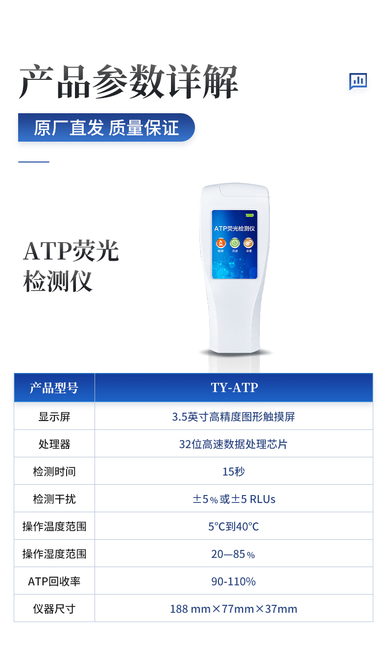 產(chǎn)品簡介: 該設(shè)備為全新升級產(chǎn)品,大屏幕觸摸顯示屏,代替?zhèn)鹘y(tǒng)按鍵。操作采用生物化學(xué)反應(yīng)方法檢測ATP含量,ATP熒光檢測儀基于螢火蟲發(fā)光原理,利用“熒光素酶—熒光素體系”快速檢測三磷酸腺苷(ATP)。ATP拭子含有可以裂解細胞膜的試劑,能將細胞內(nèi)ATP釋放出來,與試劑中含有的特異性酶發(fā)生反應(yīng),產(chǎn)生光,再