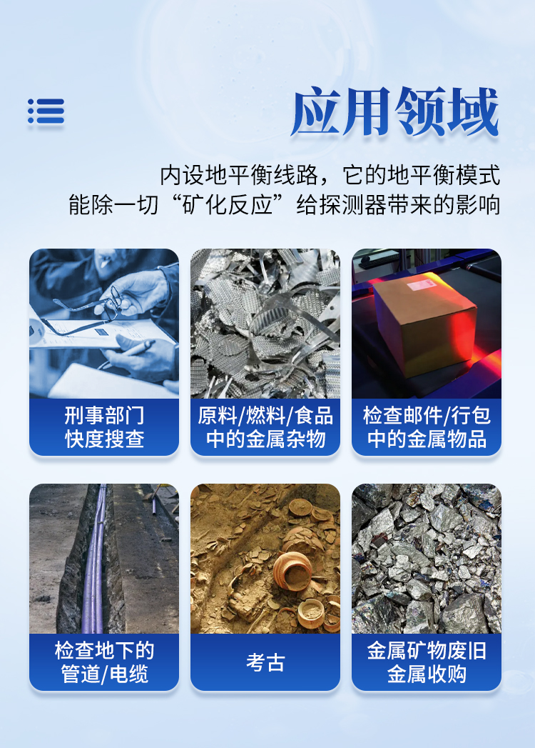 | (1)公安刑事部門快度搜查 | (2)檢測原料、燃料、食品中的 金屬雜物 | (3)檢查郵件、行包中的金屬物品 | (4)檢查地下的管道、電纜 | (5)考古 | (6)發(fā)現(xiàn)隱埋在地下的金銀寶物和金屬礦物廢舊金屬收購 |