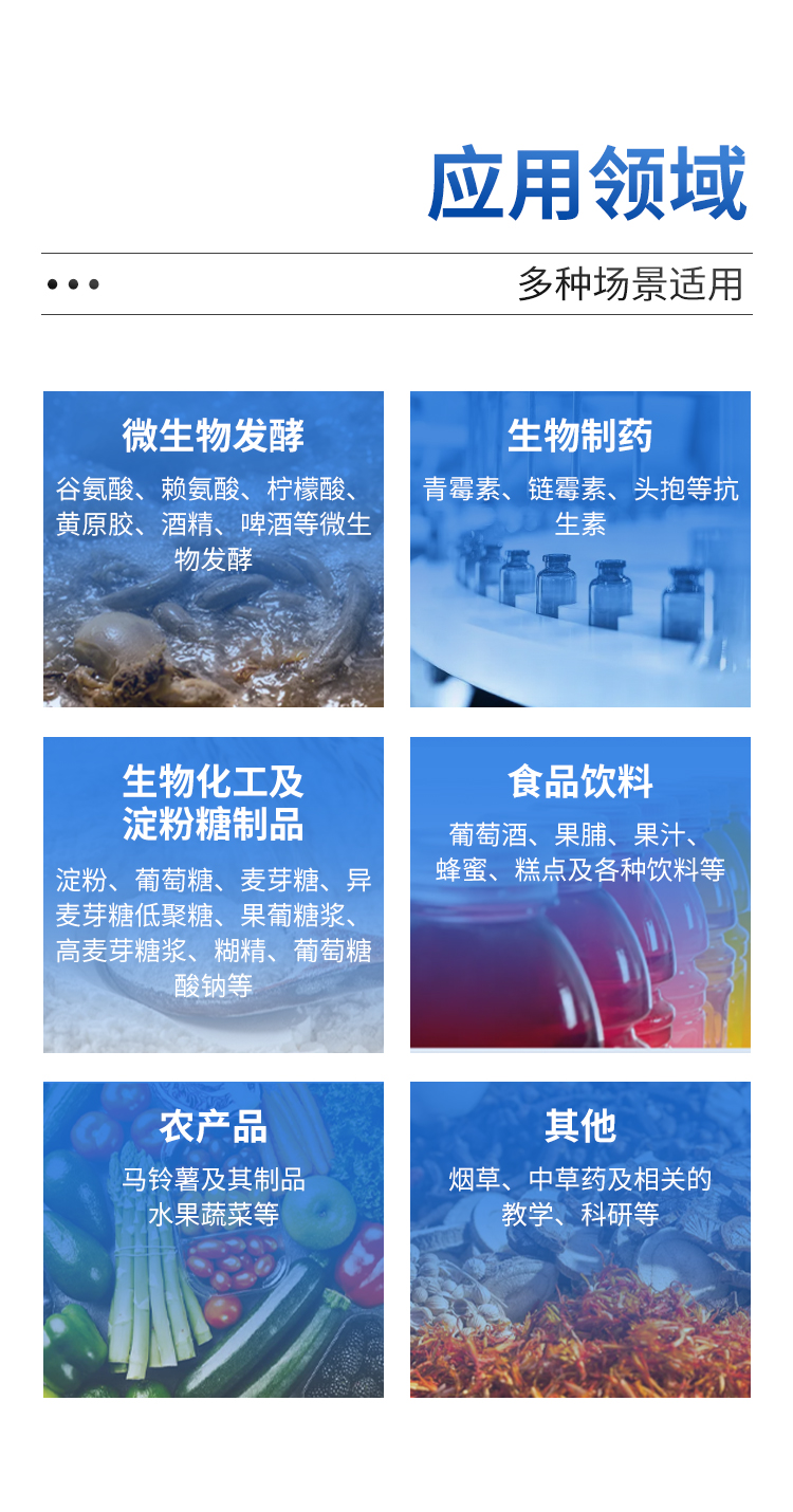 | 微生物發(fā)酵:谷氨酸、賴氨酸、檸檬酸、黃原膠、酒精、啤酒等微生物發(fā)酵 | 生物制藥:青霉素、鏈霉素、頭抱等抗生素 。生物化工及淀粉糖制品: | 淀粉、葡萄糖、麥芽糖、異麥芽糖低聚糖、果葡糖漿、高麥芽糖漿、糊精、葡萄糖酸鈉等。 | 食品飲料:葡萄酒、果脯、果汁、蜂蜜、糕點及各種飲料等。馬鈴薯及其制品、水果 | 蔬菜等農(nóng)產(chǎn)品 | 其他:煙草、中草藥及相關(guān)的教學(xué)、科研等 |