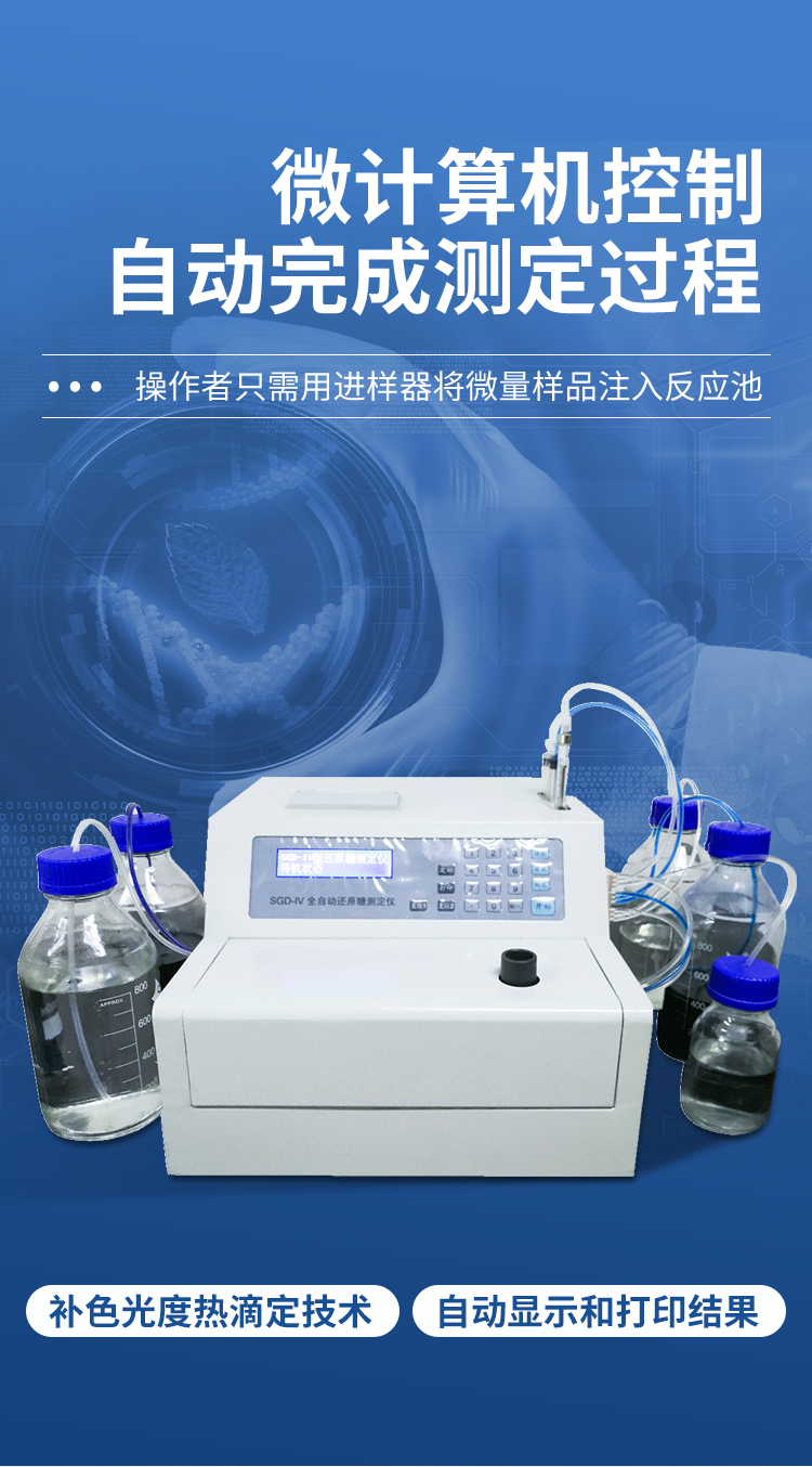 為適應(yīng)我國食品、醫(yī)藥發(fā)酵行業(yè)生產(chǎn)控制技術(shù)和過程分析中還原糖的快速檢測需求,在總結(jié)III型儀器應(yīng)用基礎(chǔ)上,研制出了全新全自動還原糖測定儀。該儀器采用補色光度熱滴定技術(shù),滴定的各種條件由微計算機控制,操作者只需用進(jìn)樣器將微量樣品注入反應(yīng)池就可自動完成測定過程,并自動顯示和打印結(jié)果,操作更簡單,使用更方便,抗干擾能力更強,測定周期更短,準(zhǔn)確度更高。