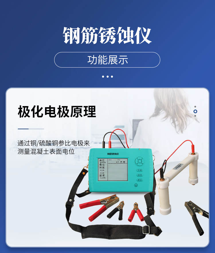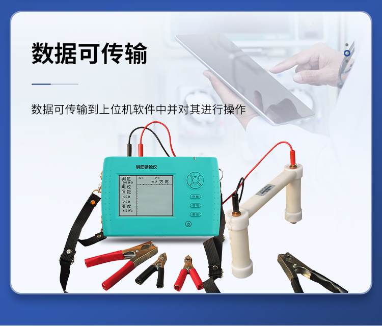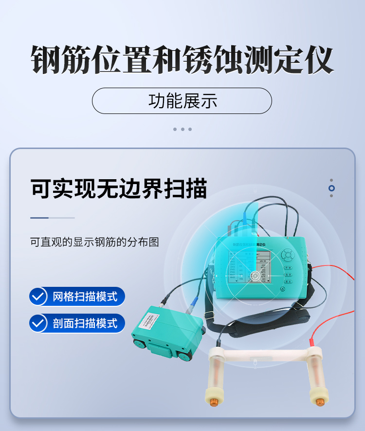 | TY-XS100鋼筋銹蝕檢測儀,采用極化電極原理,通過銅/硫酸銅參比電極來測量混凝土表面電位,根據(jù)鋼筋銹蝕生產(chǎn)的電位大小或形成的電位梯度大小判斷鋼筋是否銹蝕或銹蝕程度。 | 測量混凝土表面電位從而達到無損檢測混凝土中鋼筋的銹蝕程度。 | 儲存每個測區(qū)對應(yīng)位置的電位值,并用圖形顯示。并將數(shù)據(jù)傳輸?shù)缴衔粰C軟件中,并對其進行操作。 |