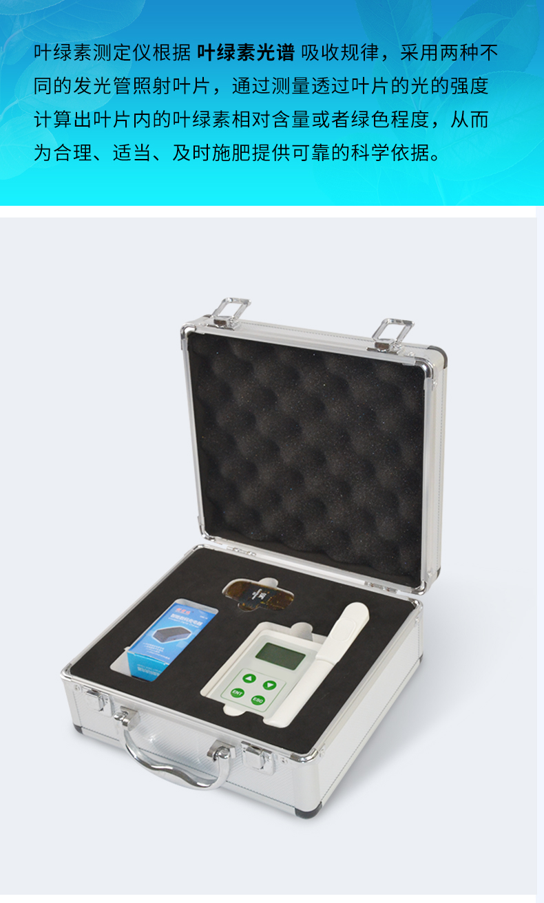 儀器用途: TY-YD葉綠素測(cè)定儀根據(jù)葉綠素光譜吸收規(guī)律,采用兩種不同的發(fā)光管照射葉片,通過(guò)測(cè)量透過(guò)葉片的光的強(qiáng)度計(jì)算出葉片內(nèi)的葉綠素相對(duì)含量或者綠色程度,從而為合理、適當(dāng)、及時(shí)施肥提供可靠的科學(xué)依據(jù),廣泛應(yīng)用于農(nóng)業(yè)、林業(yè)、植物等科學(xué)研究和生產(chǎn)指導(dǎo)。 儀器特點(diǎn):