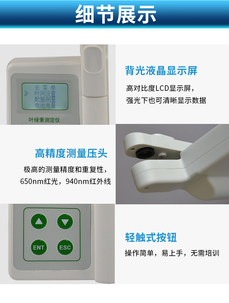 | 數(shù)據(jù)測(cè)量:**的測(cè)量精度和重復(fù)性(精度:± 1.0 SPAD,重復(fù)性:±0.3 SPAD) ,媲美進(jìn)口品牌,或可根據(jù)已知葉綠素含量的葉片或標(biāo)準(zhǔn)試樣客戶自行校準(zhǔn) | 數(shù)據(jù)分組:儀器可將數(shù)據(jù)自動(dòng)分組,并可自動(dòng)計(jì)算每組數(shù)據(jù)的平均值。可將同一葉片測(cè)量的數(shù)據(jù)自動(dòng)分為一組,便于查看每次測(cè)量數(shù)據(jù)及這一組數(shù)據(jù)的平均值,有效的避免了不同葉片的測(cè)量數(shù)據(jù)混淆。采用16GB超大存儲(chǔ),所以分組數(shù)量和每組的數(shù)據(jù)不受限制 | 數(shù)據(jù)存儲(chǔ): 16GB超大存儲(chǔ)空間,數(shù)據(jù)存儲(chǔ)量巨大 | 數(shù)據(jù)瀏覽:可在儀器上隨時(shí)瀏覽測(cè)量的數(shù)據(jù)、每組數(shù)據(jù)的平均值和刪除異常數(shù)值。數(shù)據(jù)情況更加直觀 | 數(shù)據(jù)導(dǎo)出:多功能USB接口,可實(shí)現(xiàn)數(shù)據(jù)導(dǎo)出與充電功能,可將儀器與電腦直接聯(lián)機(jī),數(shù)據(jù)以EXCEL格式導(dǎo)出,無(wú)需上位機(jī)軟件,操作簡(jiǎn)單方便 | 顯示:高對(duì)比度LCD顯示屏,強(qiáng)光下也可清晰顯示數(shù)據(jù) | 測(cè)量迅速、簡(jiǎn)便:測(cè)量時(shí)只需要將葉片插入并合上測(cè)量探頭即可,不需要采摘葉片,不影響作物正常生長(zhǎng),可以在作物的生長(zhǎng)過(guò)程中全程對(duì)特定的葉片進(jìn)行監(jiān)測(cè),從而得到更科學(xué)的分析結(jié)果 | 電池消耗:低功耗模式設(shè)計(jì),內(nèi)置大容量鋰離子充電電池,節(jié)能環(huán)保并方便進(jìn)行戶外操作 | 儀器充電:**的充電管理設(shè)計(jì),可適配多數(shù)的USB口(5V)充電器,具有防過(guò)充功能 | 易攜帶:250g的重量,方便攜帶到田間進(jìn)行活體測(cè)量 |
