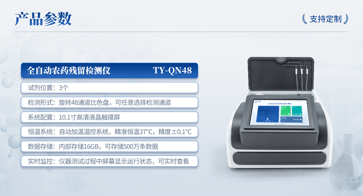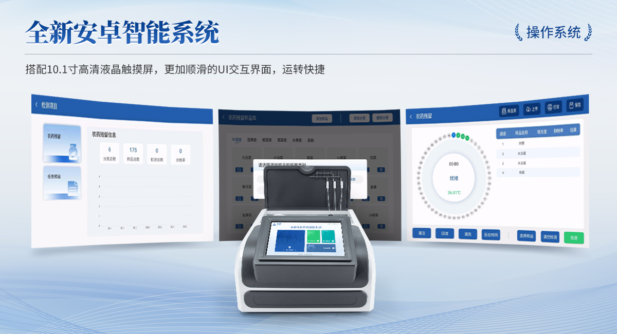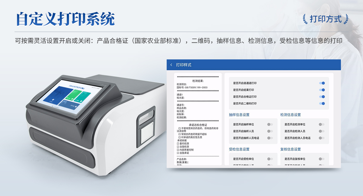| 1. 試劑位置:3個(gè) | 2. 檢測形式:旋轉(zhuǎn)48通道比色盤,可任意選擇檢測通道,自動(dòng)對應(yīng)選擇通道。 | 3. 系統(tǒng)配置:10.1寸高清液晶觸摸屏,采用ARM Cortex-A7,RK3288/4核處理器,運(yùn)行內(nèi)存1GB。Android7.1.1 系統(tǒng)分辨率1280×800。 | 4.恒溫系統(tǒng):具有自動(dòng)加溫溫控系統(tǒng),精準(zhǔn)恒溫37℃,精度±0.1℃。 | 5.添加系統(tǒng):儀器按照試劑要求自動(dòng)、按時(shí)、按量加入試劑,并且自動(dòng)對未正常放置的樣本或異常的樣本進(jìn)行檢查并提示。 | 6.清洗功能:儀器具備回流及自動(dòng)清洗管路功能,避免試劑污染。 | 7.混勻功能:設(shè)備具備自動(dòng)混勻功能。 | 8.光源校準(zhǔn):設(shè)備可自動(dòng)校準(zhǔn),確保檢測準(zhǔn)確度。 | 9.實(shí)時(shí)監(jiān)控:儀器測試過程中屏幕顯示運(yùn)行狀態(tài),可實(shí)時(shí)查看。 | 10.數(shù)據(jù)存儲(chǔ):內(nèi)部存儲(chǔ)16GB,可存儲(chǔ)500萬條數(shù)據(jù)。 | 11.樣品多選功能:設(shè)備具備樣品一鍵多選功能,選擇樣品自動(dòng)匹配檢測通道。 | 12.項(xiàng)目預(yù)設(shè):可提前設(shè)置單個(gè)及多個(gè)相同或不相同的檢測任務(wù),可單次或者多次調(diào)取,減少檢測時(shí)間。 | 13.自定義打印系統(tǒng):內(nèi)置自定義打印系統(tǒng),可按需靈活設(shè)置開啟或關(guān)閉:產(chǎn)品合格證(國家農(nóng)業(yè)部標(biāo)準(zhǔn)),二維碼,抽樣信息、檢測信息,受檢信息等信息的打印。 | 14.A4版本報(bào)告打印功能:設(shè)備可自動(dòng)生成A4版報(bào)告,A4報(bào)告帶二維碼,可掃描二維碼生成電子版,并可識(shí)別真?zhèn)巍?/td> | 15.傳輸方式:儀器配備無線通信模塊: 4G(APN)通訊模塊、Wifi模塊,藍(lán)牙傳輸模塊,同時(shí)具有USB接口以及RJ45接口能以多種方式實(shí)現(xiàn)數(shù)據(jù)保存和數(shù)據(jù)傳輸功能,設(shè)備數(shù)據(jù)可以同步上傳至平臺(tái)。 | 16.數(shù)據(jù)監(jiān)管系統(tǒng):設(shè)備自帶監(jiān)管平臺(tái),并可同步對接監(jiān)管平臺(tái),數(shù)據(jù)可局域網(wǎng)和互聯(lián)網(wǎng)數(shù)據(jù)上傳,檢測結(jié)果可直接傳至食品安全監(jiān)管平臺(tái)。達(dá)到食品安全問題預(yù)估、預(yù)警。 | 17.系統(tǒng)遠(yuǎn)程更新功能:無需設(shè)備返廠,即可遠(yuǎn)程實(shí)時(shí)升級全新系統(tǒng),節(jié)省時(shí)間成本及避免運(yùn)輸造成設(shè)備損。 |