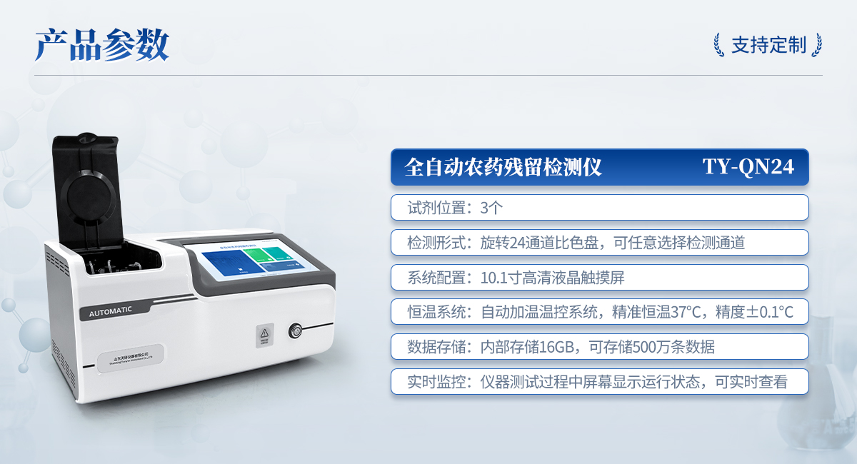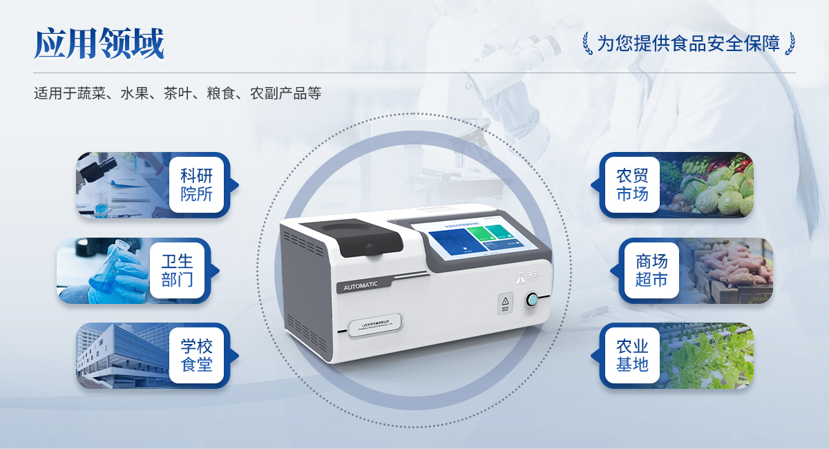 全自動農(nóng)藥殘留檢測儀是依據(jù)國家標準方法(GB/T5009.199-2003),采用酶抑制率比色法對水果、蔬菜等農(nóng)產(chǎn)品中有機磷和氨基甲酸酯類農(nóng)藥含量進行快速準確的檢測。該設(shè)備廣泛應(yīng)用于蔬菜批發(fā)市場、超市、商場、食藥監(jiān)等部門的蔬菜和水果中的農(nóng)藥殘留檢測。
