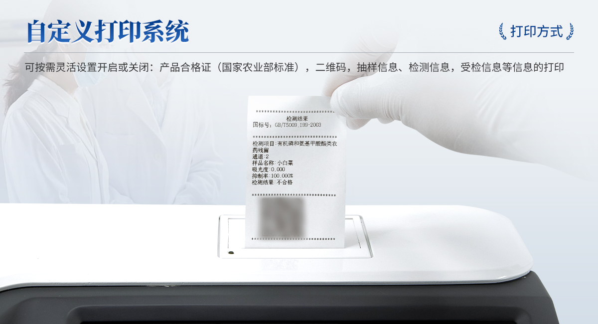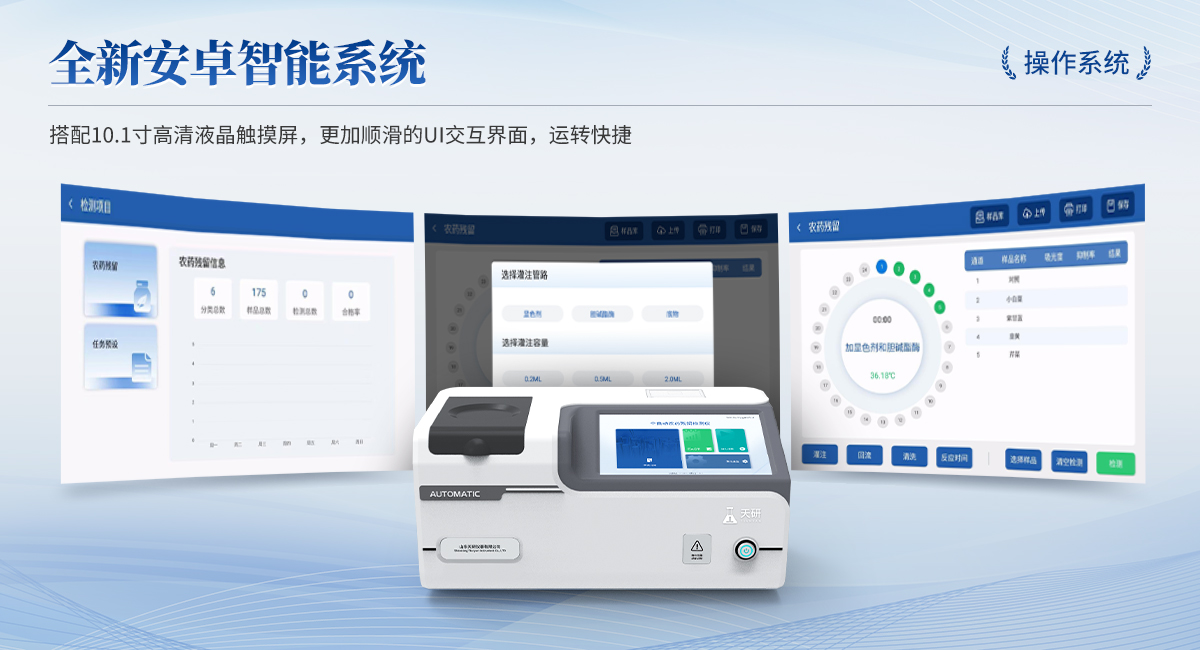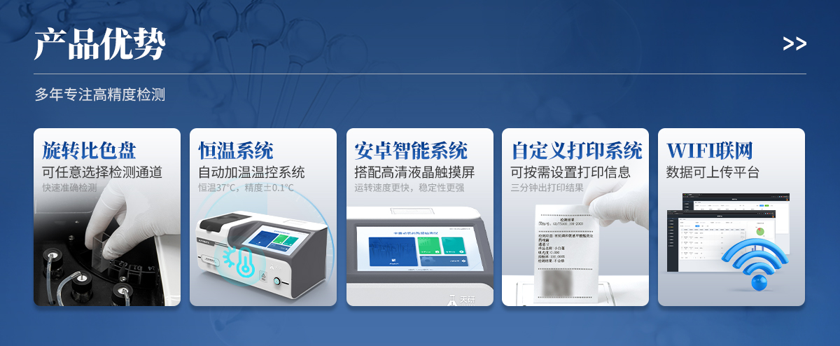 | 1. 試劑位置:3個 | 2. 檢測形式:旋轉(zhuǎn)24通道比色盤,可任意選擇檢測通道,自動對應(yīng)選擇通道。 | 3. 系統(tǒng)配置:10.1寸高清液晶觸摸屏,采用ARM Cortex?-A7,RK3288/4核處理器,運行內(nèi)存1GB。Android7.1.1 系統(tǒng)分辨率1280×800。 | 4.恒溫系統(tǒng):具有自動加溫溫控系統(tǒng),精準恒溫37℃,精度±0.1℃。 | 5.添加系統(tǒng):儀器按照試劑要求自動、按時、按量加入試劑,并且自動對未正常放置的樣本或異常的樣本進行檢查并提示。 | 6.清洗功能:儀器具備回流及自動清洗管路功能,避免試劑污染。 | 7.混勻功能:設(shè)備具備自動混勻功能。 | 8.光源校準:設(shè)備可自動校準,確保檢測準確度。 | 9.實時監(jiān)控:儀器測試過程中屏幕顯示運行狀態(tài),可實時查看。 | 10.數(shù)據(jù)存儲:內(nèi)部存儲16GB,可存儲500萬條數(shù)據(jù)。 | 11.樣品多選功能:設(shè)備具備樣品一鍵多選功能,選擇樣品自動匹配檢測通道。 | 12.項目預(yù)設(shè):可提前設(shè)置單個及多個相同或不相同的檢測任務(wù),可單次或者多次調(diào)取,減少檢測時間。 | 13.自定義打印系統(tǒng):內(nèi)置自定義打印系統(tǒng),可按需靈活設(shè)置開啟或關(guān)閉:產(chǎn)品合格證(國家農(nóng)業(yè)部標準),二維碼,抽樣信息、檢測信息,受檢信息等信息的打印。 | 14.A4版本報告打印功能:設(shè)備可自動生成A4版報告,A4報告帶二維碼,可掃描二維碼生成電子版,并可識別真?zhèn)巍?/td> | 15.傳輸方式:儀器配備無線通信模塊: 4G(APN)通訊模塊、Wifi模塊,藍牙傳輸模塊,同時具有USB接口以及RJ45接口能以多種方式實現(xiàn)數(shù)據(jù)保存和數(shù)據(jù)傳輸功能,設(shè)備數(shù)據(jù)可以同步上傳至平臺。 | 16.數(shù)據(jù)監(jiān)管系統(tǒng):設(shè)備自帶監(jiān)管平臺,并可同步對接監(jiān)管平臺,數(shù)據(jù)可局域網(wǎng)和互聯(lián)網(wǎng)數(shù)據(jù)上傳,檢測結(jié)果可直接傳至食品安全監(jiān)管平臺。達到食品安全問題預(yù)估、預(yù)警。 | 17.系統(tǒng)遠程更新功能:無需設(shè)備返廠,即可遠程實時升級全新系統(tǒng),節(jié)省時間成本及避免運輸造成設(shè)備損。 |