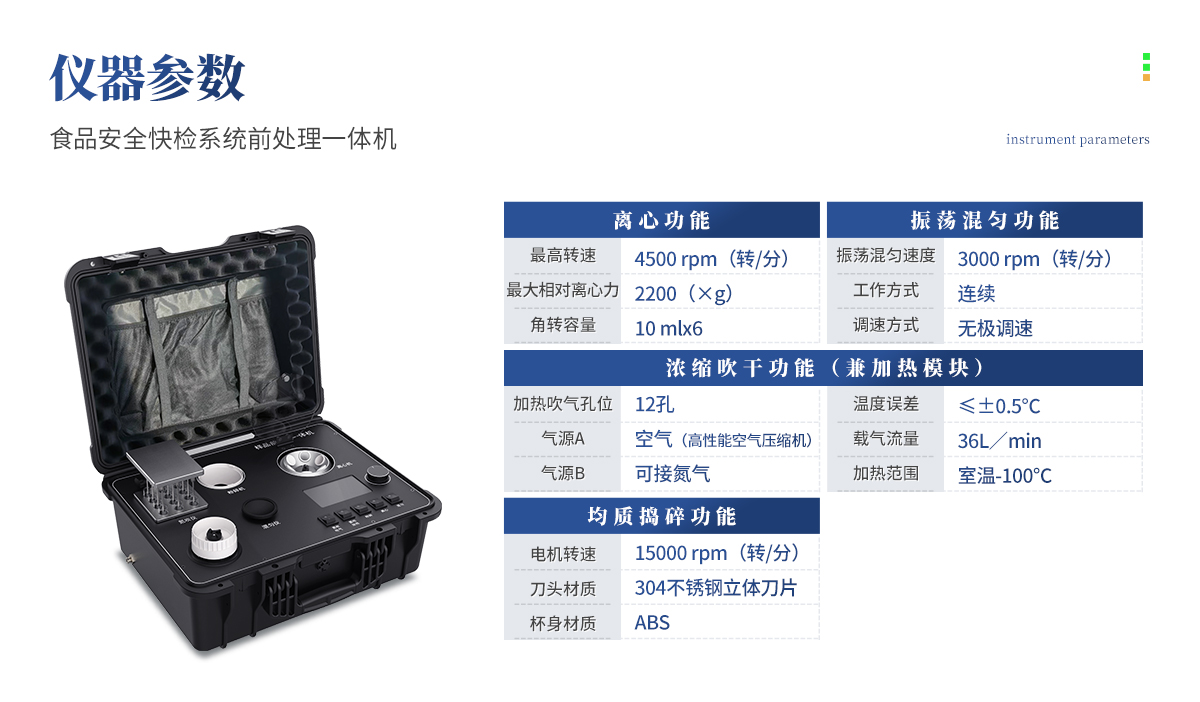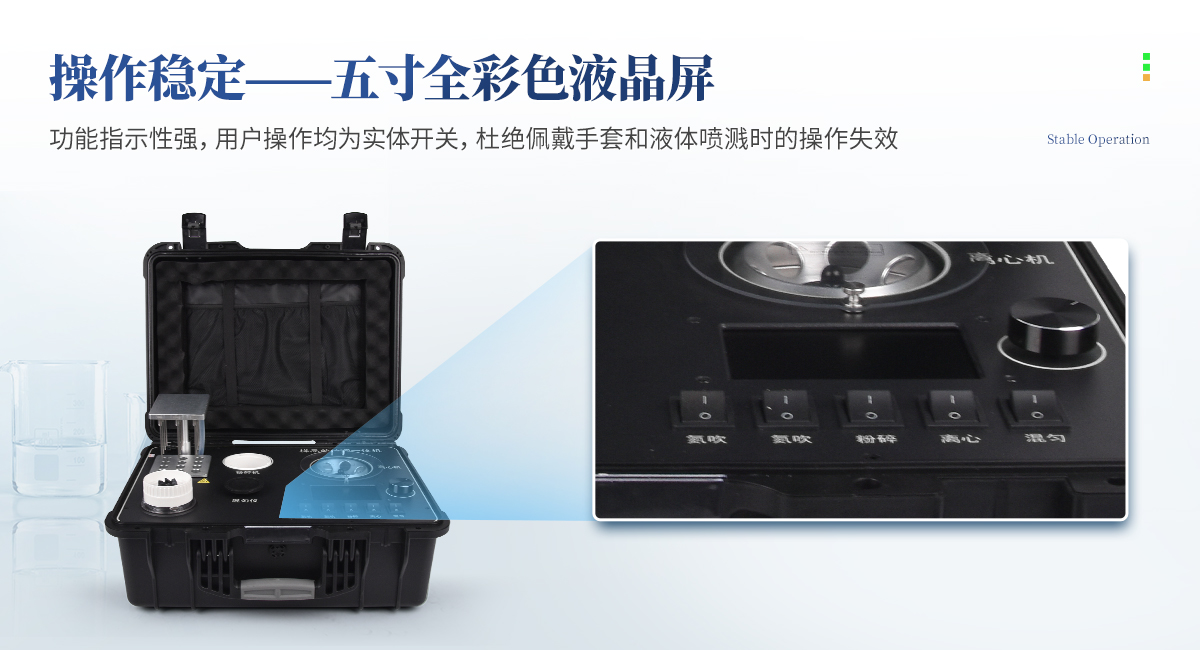 | 1、功能緊湊,集成四種樣品前處理常用的功能,完成樣品一站式處理。 | 2、結(jié)構(gòu)穩(wěn)固,機(jī)箱采用***工程塑料,具備**的抗沖擊性、耐腐蝕性、便攜性。 | 3、操作穩(wěn)定,機(jī)器采用五寸全彩色液晶屏,功能指示性強(qiáng),用戶操作均為實(shí)體開關(guān),杜絕佩戴手套和液體噴濺時(shí)的操作失效。 |