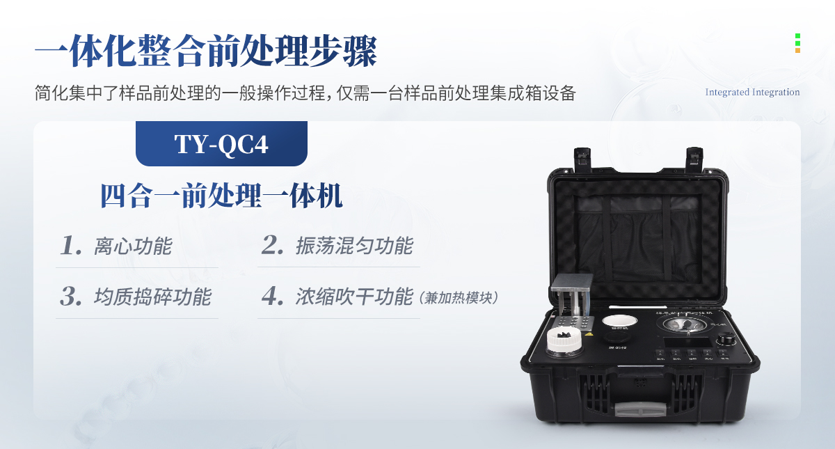 QC4型四合一樣品檢測前處理一體機(jī)(箱)是集吹干、離心、均質(zhì)、混勻功能的一體化整合,極大的簡化和集中樣品前處理的一般操作過程,結(jié)合移動(dòng)便攜的工程塑料箱體,特別適合農(nóng)獸藥殘留畜禽水產(chǎn)品質(zhì)量安全現(xiàn)場快速檢測。
