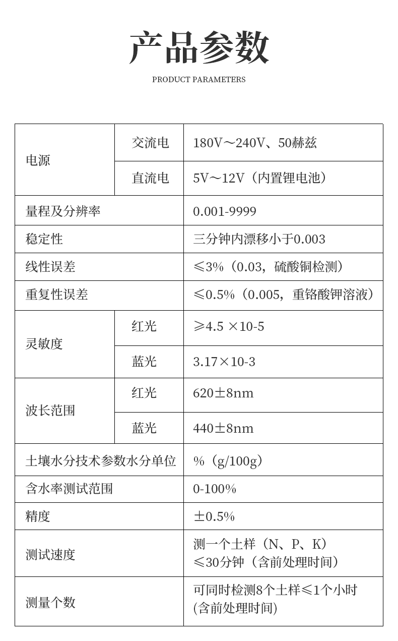 | 電源:交流電:180V~240V、50赫茲;直流電:12V+5V(可接車載電源) | 量程及分辨率:0.001-9999 | 穩(wěn)定性:三分鐘內(nèi)漂移小于0.003 | 線性誤差:≤2%(0.002,硫酸銅檢測(cè)) | 重復(fù)性誤差:≤0.5%(0.005,重鉻酸鉀溶液) | 靈敏度:紅光≥4.5 ×10-5 藍(lán)光≥3.17×10-3 | 波長(zhǎng)范圍:紅光620±8nm 藍(lán)光440±8nm | 肥料中氮(N)、磷(P)、鉀(K)等養(yǎng)分同時(shí)、快速、準(zhǔn)確檢測(cè) | 測(cè)試速度:測(cè)一個(gè)肥料樣(N、P、K)≤1個(gè)小時(shí)(含前處理時(shí)間) | 可同時(shí)檢測(cè)8個(gè)土樣≤3個(gè)小時(shí)(含前處理時(shí)間) | 數(shù)據(jù)打?。簝?nèi)置新型一鍵式熱敏打印機(jī) |