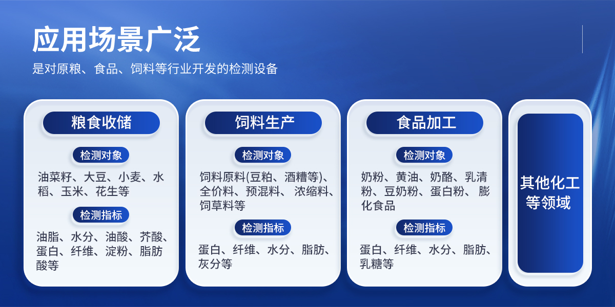 檢測(cè)對(duì)象:飼料原料(豆粕、酒糟等)、全價(jià)料、預(yù)混料、濃縮料、飼草料等 檢測(cè)指標(biāo):蛋白、纖維、水分、脂肪、灰分等;  | ◆ 食品加工: