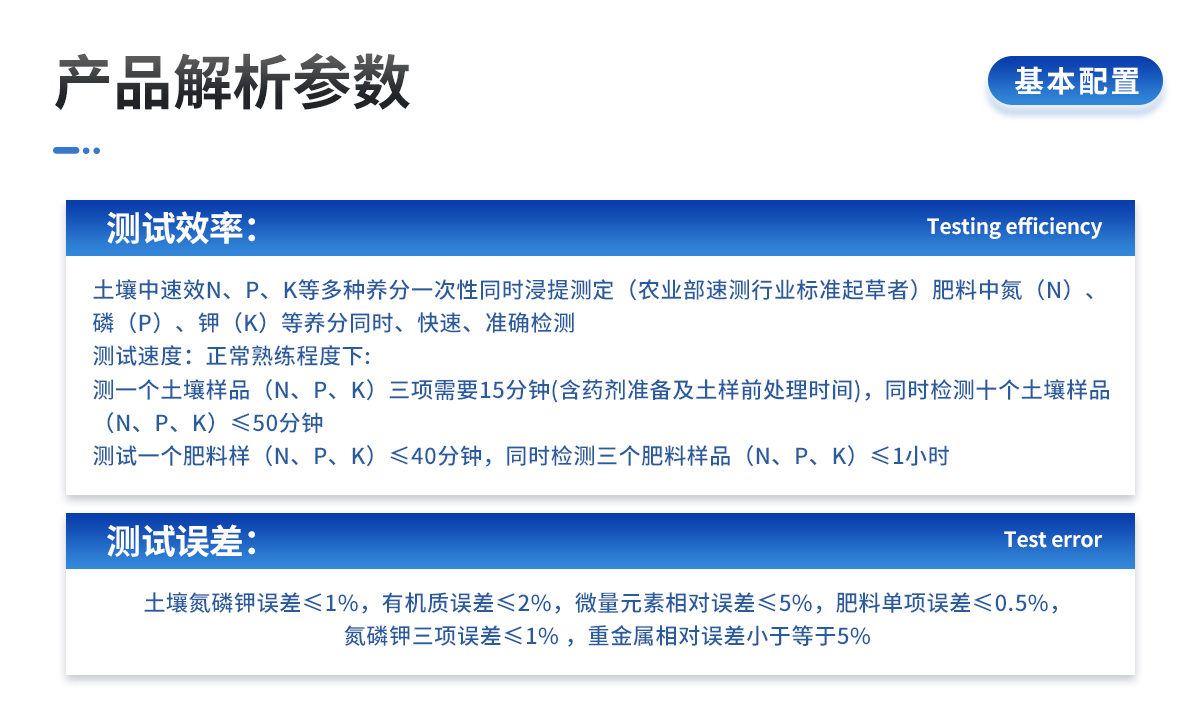 | 土壤氮磷鉀誤差≤1%,有機質(zhì)誤差≤2%,微量元素相對誤差≤5%;肥料單項誤差≤0.5%,氮磷鉀三項誤差≤1%。 |