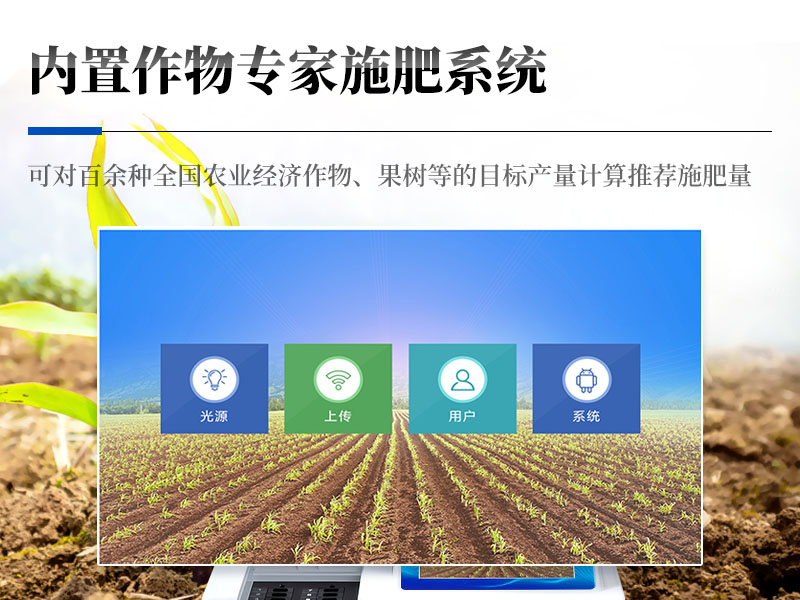 產(chǎn)品簡介: 配套齊全:該儀器無需用戶自配附件,相當(dāng)于一個小型實驗室。適于農(nóng)業(yè)服務(wù)部門或農(nóng)資經(jīng)銷商、合作社、肥料廠商、大種植戶測土施肥和鑒別肥料真假。 檢測功能全:測試項目國內(nèi)外全面,除標(biāo)配試劑外,其他各