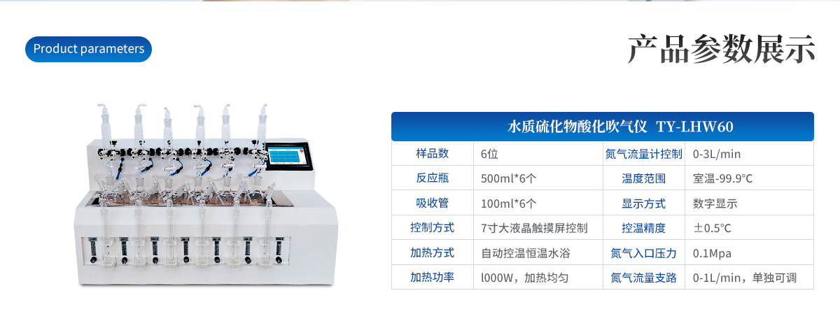 水樣中的硫化物經酸化,生成的硫化氫隨載氣(氮氣)進入吸收瓶/吸收顯色管中被吸收溶液(乙酸鋅-乙酸鈉溶液或2%氫氧化鈉溶液)吸收,選擇相應的分析方法對吸收瓶/吸收顯色管中吸收的硫離子進行分析測定。硫化物吹氣儀根據(jù)2022年新國標水質硫化物的測定-亞甲基藍分光光度法(典量法)標準開發(fā)生產的。水質硫化物測定的樣品前處理需要。