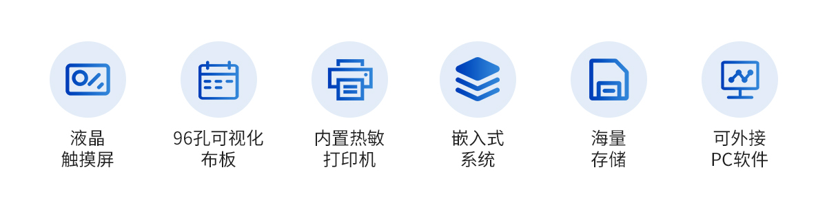 | 1. 內(nèi)置嵌入式系統(tǒng),無需外接電腦即可操作、存儲、打印。 | 2. 全屏顯示96孔整板數(shù)據(jù), 直觀的可視化布板操作界面。 | 3. 便捷的觸摸屏輸入,另可選配外接鼠標(biāo)和鍵盤。 | 4. 測量模式:單波長檢測,雙波長檢測,兩點法,動力學(xué)法,酶抑制率,終點法、速率法。 | 5. 可選擇吸光度、Cut-Off定性計算、單點定標(biāo)、折線回歸、線性回歸、指數(shù)回歸、對數(shù)回歸、雙對數(shù)回歸、log-logit、冪回歸、四參數(shù)回歸、酶抑制率等計算方法。 | 6. 在同一板上可進行多至12個不同項目的測試,并可同一板檢測定性和定量項目。 | 7. *全面完善的質(zhì)控功能,包含westguard多規(guī)則質(zhì)控,即刻法質(zhì)控等多種質(zhì)控圖及質(zhì)控參數(shù)計算,具有質(zhì)控報警功能。 | 8. 具有靈活的定性公式輸入功能,滿足各種相同及不同試劑的不同的參數(shù)設(shè)置。 | 9. 布板和保存導(dǎo)入功能,大幅提高常用項目的測試效率。 | 10. 可選配外接PC軟件,網(wǎng)絡(luò)化支持,迎合數(shù)字化發(fā)展方向,可定制上傳。 | 11. 全新風(fēng)格彩色圖形化界面,全中文操作系統(tǒng),支持鼠標(biāo)、鍵盤,支持輸入法。 | 12. 光源智能開關(guān),延長其壽命。 | 13. 提供多種打印方式及多種形式中文報告,并可定制各式報告。 | 14. 專用系統(tǒng)維護菜單,自動判斷儀器當(dāng)前狀態(tài)及性能指標(biāo),并可打印相關(guān)數(shù)據(jù) |