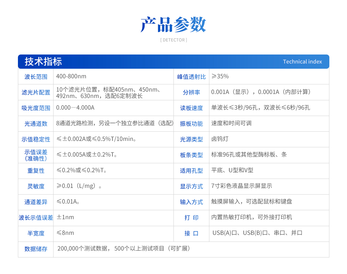 | *波長范圍: 400-800nm *濾光片配置:10個濾光片位置,標(biāo)配405nm、450nm、492nm、630nm,選配6定制波長 吸光度范圍:0.000―4.000A *光通道數(shù):8通道光路檢測,另設(shè)一個獨立參比通道(選配) *示值穩(wěn)定性:≤±0.002A或≤0.5%T/10min *示值誤差(準(zhǔn)確性):≤±0.005A或±0.2%T *重復(fù)性:≤0.2%或≤0.2%T 靈敏度:≥0.01(L/mg) 通道差異:≤0.01A 波長示值誤差:±1nm 半寬度:≤8nm 峰值透射比:≥35% 分辨率:0.001A(顯示),0.0001A(內(nèi)部計算) *讀板速度:單波長≤3秒/96孔,雙波長≤6秒/96孔 振板功能:速度和時間可調(diào) 光源類型:鹵鎢燈 板條類型:標(biāo)準(zhǔn)96孔或其他型酶標(biāo)板、條 適用孔型:平底、U型和V型 顯示方式:7寸彩色液晶顯示屏顯示 輸入方式:觸摸屏輸入,可選配鼠標(biāo)和鍵盤 打?。簝?nèi)置熱敏打印機,可外接打印機 接 口: USB(A)口、USB(B)口、串口、并口 *數(shù)據(jù)儲存:200,000個測試數(shù)據(jù),500個以上測試項目(可擴展) 使用環(huán)境:溫度5-40℃;濕度15%-80% 電源電壓:220V±10%,50/60Hz 體積:475mm×350mm×210mm(長×寬×高) 重量:11.5Kg  |