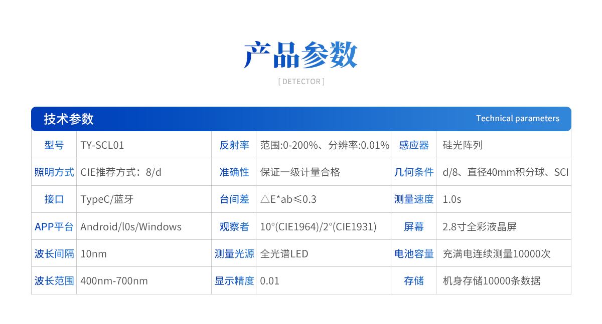| 型號(hào):TY-SCL01 照明方式:CIE推薦方式:8/d 幾何條件:TypeC/藍(lán)牙 APP平臺(tái):Android/l0s/Windows 波長(zhǎng):間隔:10nm、范圍: 400nm-700nm 反射率:范圍:0-200%、分辨率:0.01% 準(zhǔn)確性:保證一級(jí)計(jì)量合格 臺(tái)間差:△E*ab≤0.3 觀察者:10°(CIE1964)/2°(CIE1931) 測(cè)量光源:全光譜LED 顯示精度:0.01 感應(yīng)器:感應(yīng)器 幾何條件:d/8、直徑40mm積分球、SCI 測(cè)量速度:1.0s 屏幕:2.8寸全彩液晶屏 電池容量:聚合物電池、充滿電連續(xù)測(cè)量10000次 語(yǔ)言:簡(jiǎn)體中文、繁體中文、English 存儲(chǔ):機(jī)身存儲(chǔ)10000條數(shù)據(jù) 尺寸:172*80*60mm 外包裝尺寸:300*280*255mm 標(biāo)準(zhǔn)配件:儀器機(jī)身、黑白校準(zhǔn)筒、TYPEC數(shù)據(jù)線、充電器、說(shuō)明書、保修卡,掛繩、測(cè)量口徑4個(gè)(雙口徑版) 選購(gòu)配件:粉末測(cè)試盒、微型打印機(jī)  |