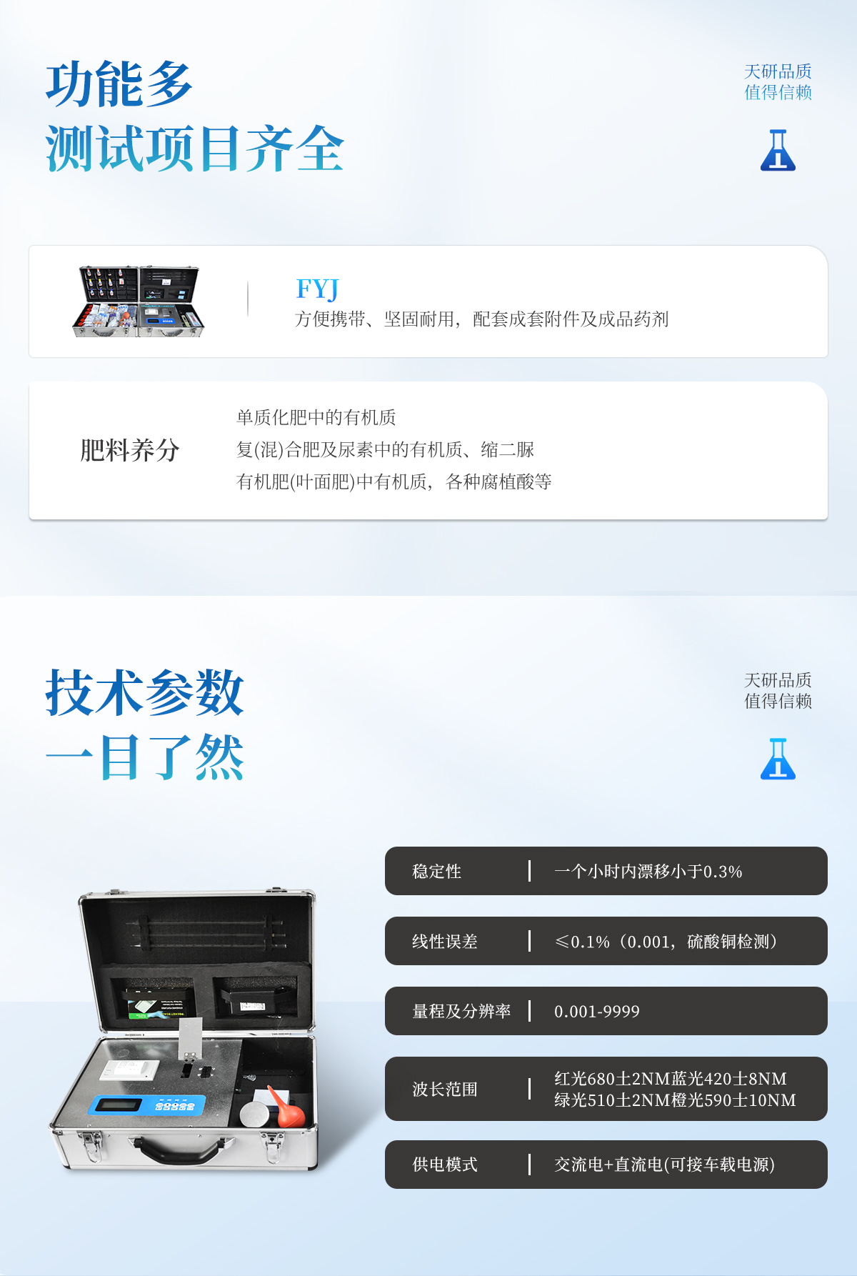 | 肥料養(yǎng)分專用檢測儀功能全:測試項目國內(nèi)外*全(各類藥劑均可選購)。 | 配套齊全,該儀器集藥、器、儀為一體,攜帶方便,相當于一個小型實驗室,用戶只需提供蒸餾水即可在要求時間內(nèi)完成全部操作。適于農(nóng)業(yè)服務部門或農(nóng)資經(jīng)銷商鑒別肥料真假、肥料廠商肥料生產(chǎn)中控、農(nóng)資質(zhì)檢部門進行農(nóng)資打假,規(guī)范農(nóng)資市場。 | 性能可靠:工作穩(wěn)定性優(yōu)于國家標準JJG179-90指標的10倍以上,重復性達到光柵型分光光度計指標水平。 |