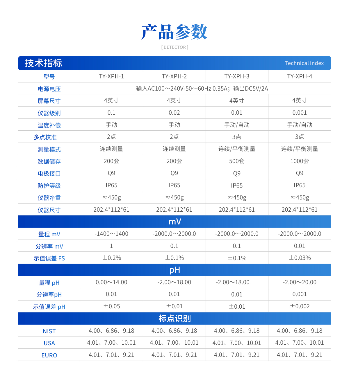 產(chǎn)品概述:XPH系列便攜式酸度計是一款實驗室pH測量儀器,可廣泛應(yīng)用高校、環(huán)保、醫(yī)藥、食品、衛(wèi)生、地質(zhì)探礦、冶金、海洋探測等領(lǐng)域,常見的酸雨檢測、工業(yè)廢水、地表水、飲用水、飲料、日化產(chǎn)品、紡織品等,均需要進(jìn)行pH測量。產(chǎn)品優(yōu)點:1.支持IP65防護(hù)等級。2.支持自動識別NIST、USA、EURO*多三點標(biāo)定功能。3.支持背光和恢