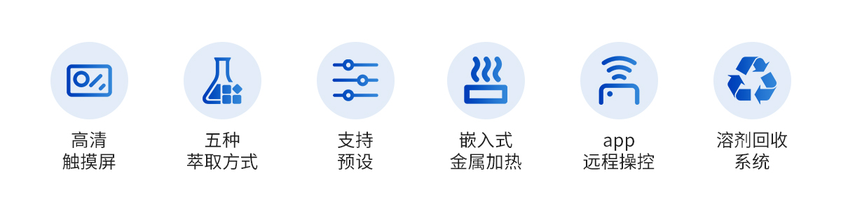 | ?全部有機溶劑均可使用,包括苯類、微類、酮類 等,滿足各種有機溶劑的使用條件 | ?采用全自動標準索氏萃取,全通道為玻璃與四氟材質(zhì),有效避免雜質(zhì)的引入,準確性高 | ?可以app遠程操作控制,實現(xiàn)遠程通訊功能,方便客戶實時查看實驗允許情況 | ?采用一鍵開始與暫停操作,實驗過程掌控靈活 | ?外置壁掛型控制器,方便靈活,簡單快捷 | ?采用七寸大液晶觸摸屏控制,顯示屏具有折疊功能,不用時可以收起不占用空間 | ?五種萃取方式,滿足不同客戶萃取需求 | ?預設(shè)常用試劑選項,高頻次實驗一鍵輕松搞定 | ?整體嵌入式金屬加熱,升溫更快,效率更高 | ?進出水路溫度監(jiān)控與流量控制,配合冷凝水有無實時監(jiān)測,保證有機蒸氣冷凝回流無泄漏的效果下,節(jié)約水資源 | ?具有高-效的溶劑回收系統(tǒng),有效減少試劑的浪費 |