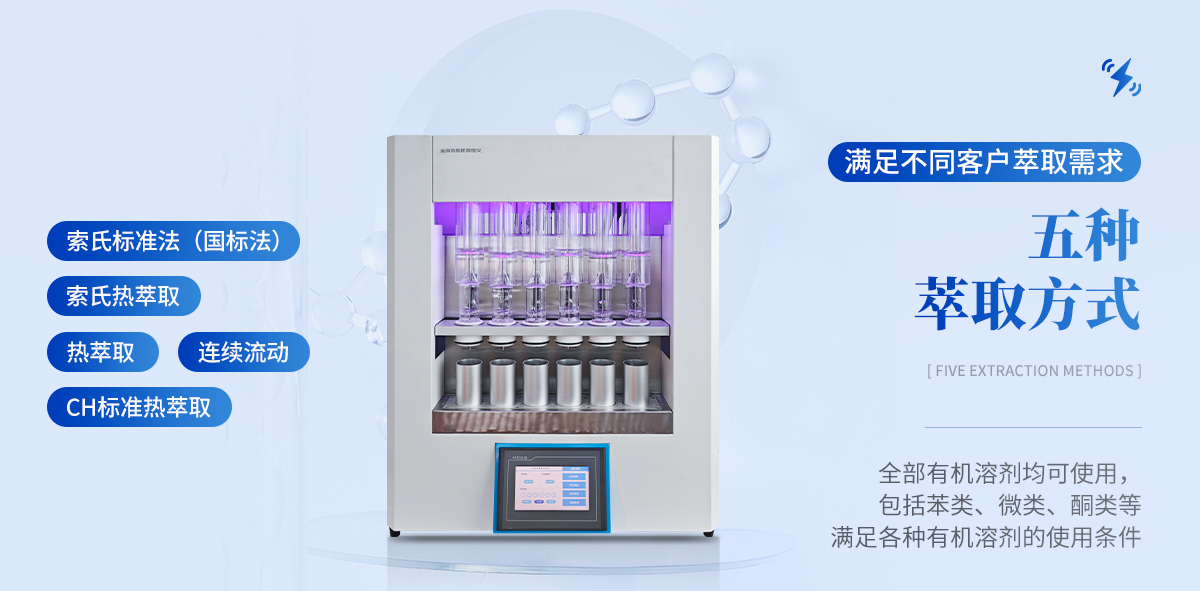 全自動脂肪測定儀(索氏提取儀)是根據(jù)索氏抽提原理,對脂肪等有機物進行萃取分離的儀器。儀器具有索氏標準法(國標法)、索氏熱萃取、熱萃取、連續(xù)流動及CH標準熱萃取等五種萃取方式;采用整體嵌入式金屬加熱,升溫快, 效果好,功耗低。安卓風格界面設(shè)計,豎屏外置壁掛式控制器,使操作更加簡便快捷;進出水路全方位溫度監(jiān)控與流量控 制,更加環(huán)保與節(jié)約;內(nèi)置乙謎泄漏檢測 裝置有效防止空氣污染,充分保障了實驗的安全性。