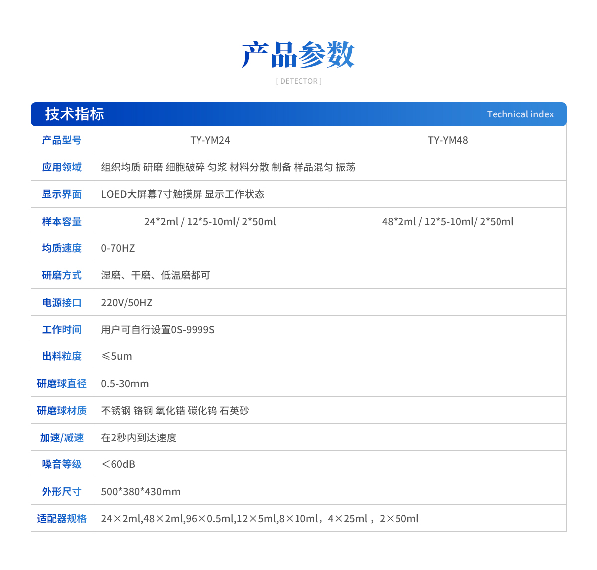 顯示界面:LOED大屏幕7寸觸摸屏 顯示工作狀態(tài) 樣本容量:24*2ml / 12*5-10ml/ 2*50ml 均質(zhì)速度:0-70HZ 研磨方式:濕磨 干磨 低溫磨都可 電源接口:220V/50HZ 工作時(shí)間:用戶可自行設(shè)置0S-9999S 出料粒度:≤5um 研磨球直徑:0.5-30mm 研磨球材質(zhì):不銹鋼 鉻鋼 氧化鋯 碳化鎢 石英砂 加速減速:加速/減速 在2秒內(nèi)到達(dá)速度 噪音等級(jí):<60dB 外形尺寸:500*380*430mm 適配器規(guī)格:24×2ml,48×2ml,96×0.5ml,12×5ml,8×10ml,4×25ml ,2×50ml  |